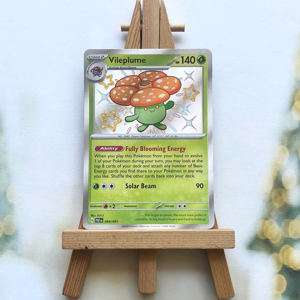 Thẻ hình Pokemon Vileplume 094/091 - Lá bài Scarlet & Violet: Paldean Fates Shiny Rare tiếng Anh chính hãng Nintendo - Nhập khẩu Hoa Kỳ USA ➖➖➖➖➖➖ Sản phẩm chính hãng TCG, được sản xuất bởi The Pokémon Company, nên quý khách có thể yên tâm về chất lượng và độ độc đáo của từng thẻ bài. Chúng tôi cam kết chỉ bán hàng chính hãng và nói không với hàng nhái, hàng giả mạo. Mỗi thẻ bài đều ở trong tình trạng NM-M và sẽ là một phần không thể thiếu cho bộ sưu tập của bạn, giúp bạn có những trải nghiệm thú vị và phong phú. Chất liệu chính của thẻ bài là giấy cao cấp, đảm bảo độ bền và màu sắc sống động, chi tiết. Dòng sản phẩm: TCG Hãng sản xuất: The Pokémon Company Chất liệu: Giấy Kích thước thẻ bài: 6,3×8,8cm ➖➖➖➖➖➖ Thông Báo Hướng Dẫn Bảo Quản và Kiểm Tra Sản Phẩm Thẻ Bài: ✅ Quay Video Khi Mở Kiện: Để đảm bảo quyền lợi, khi nhận sản phẩm, vui lòng quay video quá trình mở kiện. Video này sẽ là bằng chứng đối chiếu quý giá, giúp chúng tôi nhanh chóng giải quyết mọi vấn đề và thắc mắc của bạn. ✅ Mọi sản phẩm như Gói thẻ bài (Pack lẻ), Booster Box, Bộ bài nguyên hộp phải còn nguyên niêm phong và bao bì. Chỉ những sản phẩm còn giữ nguyên vẹn mới được chấp nhận đổi trả hoàn tiền. ✅ Các lá bài chính hãng có thể bị cong khi tiếp xúc với không khí. Đây là hiện tượng bình thường, bạn có thể khắc phục bằng cách sử dụng bọc bài, cất vào album, hoặc ép giữa quyển vở dày. ✅ Một số lá bài có thể xuất hiện các vết trầy xước nhỏ, nhưng không ảnh hưởng đến chất lượng và quá trình sử dụng của bạn. ✅ Chúng tôi không chịu trách nhiệm về nội dung bên trong các gói và hộp thẻ bài do đóng gói và niêm phong từ nhà sản xuất. Mọi thắc mắc và khiếu nại, vui lòng liên hệ trực tiếp với chúng tôi, ➖➖➖➖➖➖