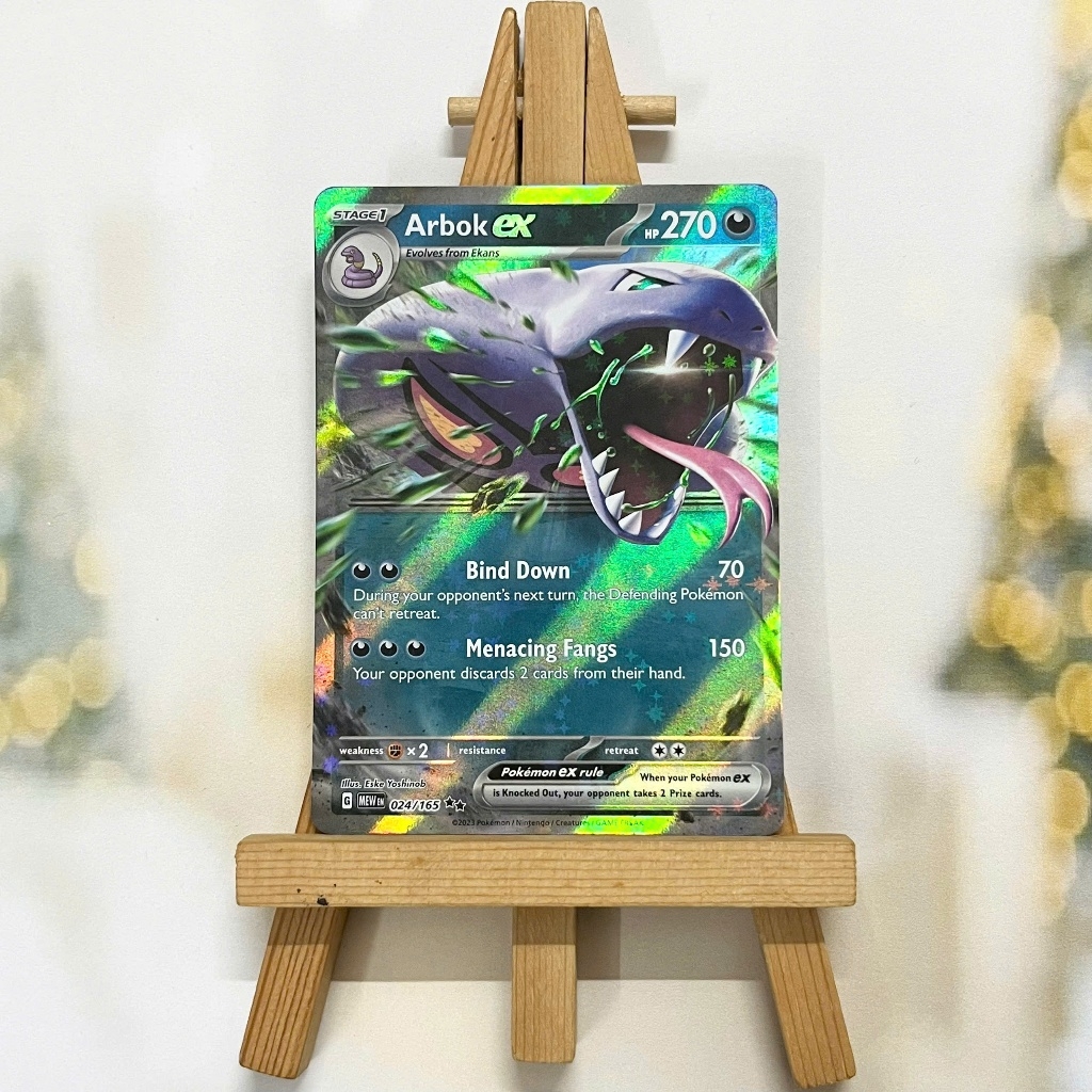 Thẻ hình Pokemon Arbok ex 024/165 - Lá bài Scarlet & Violet 151 Ultra Rare tiếng Anh chính hãng Nintendo - Nhập khẩu Hoa Kỳ USA ➖➖➖➖➖➖ Sản phẩm chính hãng TCG, được sản xuất bởi The Pokémon Company, nên quý khách có thể yên tâm về chất lượng và độ độc đáo của từng thẻ bài. Chúng tôi cam kết chỉ bán hàng chính hãng và nói không với hàng nhái, hàng giả mạo. Mỗi thẻ bài đều ở trong tình trạng NM-M và sẽ là một phần không thể thiếu cho bộ sưu tập của bạn, giúp bạn có những trải nghiệm thú vị và phong phú. Chất liệu chính của thẻ bài là giấy cao cấp, đảm bảo độ bền và màu sắc sống động, chi tiết. Dòng sản phẩm: TCG Hãng sản xuất: The Pokémon Company Chất liệu: Giấy Kích thước thẻ bài: 6,3×8,8cm ➖➖➖➖➖➖ Thông Báo Hướng Dẫn Bảo Quản và Kiểm Tra Sản Phẩm Thẻ Bài: ✅ Quay Video Khi Mở Kiện: Để đảm bảo quyền lợi, khi nhận sản phẩm, vui lòng quay video quá trình mở kiện. Video này sẽ là bằng chứng đối chiếu quý giá, giúp chúng tôi nhanh chóng giải quyết mọi vấn đề và thắc mắc của bạn. ✅ Mọi sản phẩm như Gói thẻ bài (Pack lẻ), Booster Box, Bộ bài nguyên hộp phải còn nguyên niêm phong và bao bì. Chỉ những sản phẩm còn giữ nguyên vẹn mới được chấp nhận đổi trả hoàn tiền. ✅ Các lá bài chính hãng có thể bị cong khi tiếp xúc với không khí. Đây là hiện tượng bình thường, bạn có thể khắc phục bằng cách sử dụng bọc bài, cất vào album, hoặc ép giữa quyển vở dày. ✅ Một số lá bài có thể xuất hiện các vết trầy xước nhỏ, nhưng không ảnh hưởng đến chất lượng và quá trình sử dụng của bạn. ✅ Chúng tôi không chịu trách nhiệm về nội dung bên trong các gói và hộp thẻ bài do đóng gói và niêm phong từ nhà sản xuất. Mọi thắc mắc và khiếu nại, vui lòng liên hệ trực tiếp với chúng tôi.
