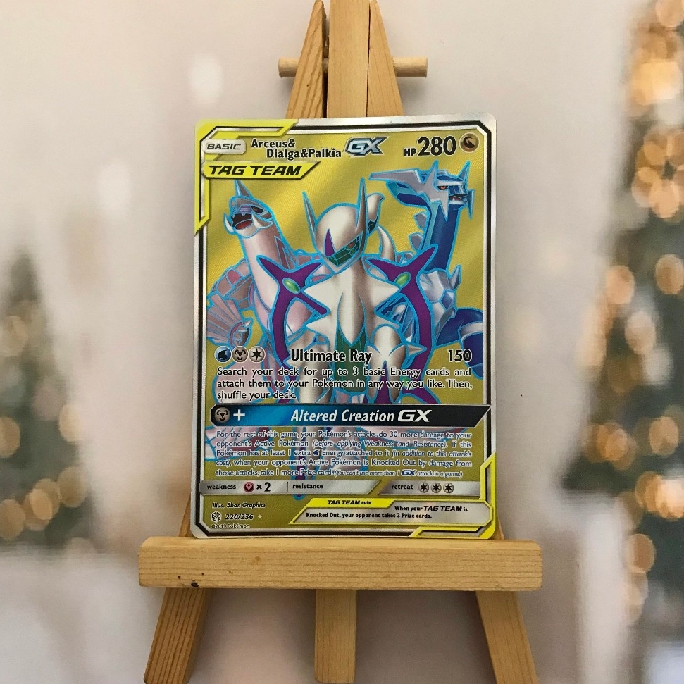Thẻ hình Pokemon Arceus & Dialga & Palkia GX 220/236 - Bài lẻ Full Art Ultra Rare tiếng Anh chính hãng Nintendo - Nhập khẩu Hoa Kỳ USA ➖➖➖➖➖➖ Sản phẩm chính hãng TCG, được sản xuất bởi The Pokémon Company, nên quý khách có thể yên tâm về chất lượng và độ độc đáo của từng thẻ bài. Chúng tôi cam kết chỉ bán hàng chính hãng và nói không với hàng nhái, hàng giả mạo. Mỗi thẻ bài đều ở trong tình trạng NM-M và sẽ là một phần không thể thiếu cho bộ sưu tập của bạn, giúp bạn có những trải nghiệm thú vị và phong phú. Chất liệu chính của thẻ bài là giấy cao cấp, đảm bảo độ bền và màu sắc sống động, chi tiết. Dòng sản phẩm: TCG Hãng sản xuất: The Pokémon Company Chất liệu: Giấy Kích thước thẻ bài: 6,3×8,8cm ➖➖➖➖➖➖ Thông Báo Hướng Dẫn Bảo Quản và Kiểm Tra Sản Phẩm Thẻ Bài: ✅ Quay Video Khi Mở Kiện: Để đảm bảo quyền lợi, khi nhận sản phẩm, vui lòng quay video quá trình mở kiện. Video này sẽ là bằng chứng đối chiếu quý giá, giúp chúng tôi nhanh chóng giải quyết mọi vấn đề và thắc mắc của bạn. ✅ Mọi sản phẩm như Gói thẻ bài (Pack lẻ), Booster Box, Bộ bài nguyên hộp phải còn nguyên niêm phong và bao bì. Chỉ những sản phẩm còn giữ nguyên vẹn mới được chấp nhận đổi trả hoàn tiền. ✅ Các lá bài chính hãng có thể bị cong khi tiếp xúc với không khí. Đây là hiện tượng bình thường, bạn có thể khắc phục bằng cách sử dụng bọc bài, cất vào album, hoặc ép giữa quyển vở dày. ✅ Một số lá bài có thể xuất hiện các vết trầy xước nhỏ, nhưng không ảnh hưởng đến chất lượng và quá trình sử dụng của bạn. ✅ Chúng tôi không chịu trách nhiệm về nội dung bên trong các gói và hộp thẻ bài do đóng gói và niêm phong từ nhà sản xuất. Mọi thắc mắc và khiếu nại, vui lòng liên hệ trực tiếp với chúng tôi, ➖➖➖➖➖➖