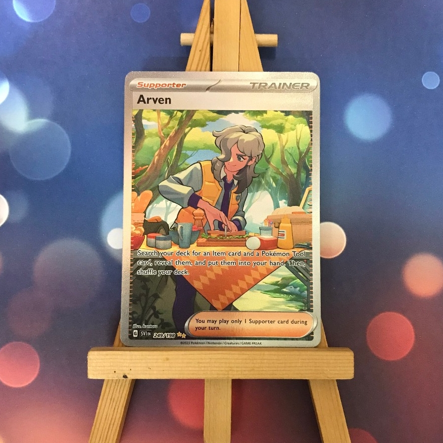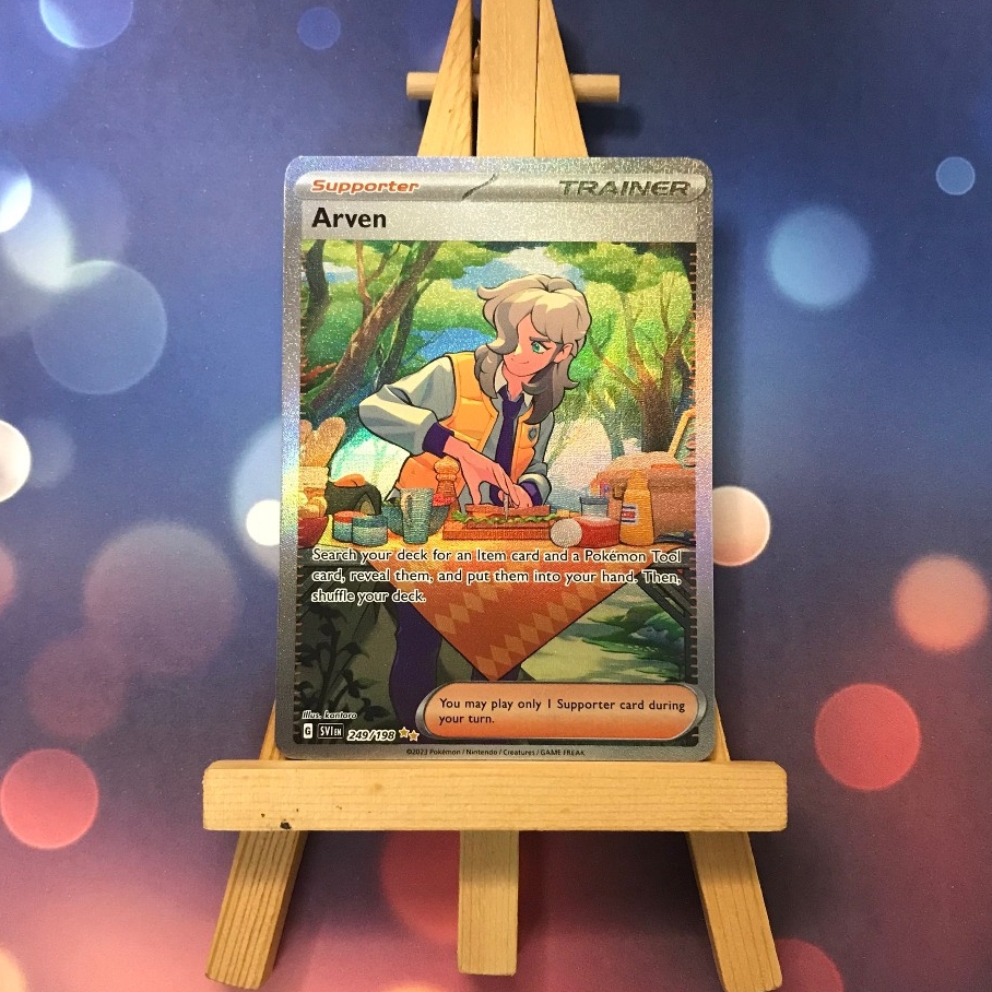 Thẻ hình Pokemon Arven 249/198 - Bài lẻ Special Illustration Rare tiếng Anh chính hãng Nintendo - Nhập khẩu Hoa Kỳ USA ➖➖➖➖➖➖ Sản phẩm chính hãng TCG, được sản xuất bởi The Pokémon Company, nên quý khách có thể yên tâm về chất lượng và độ độc đáo của từng thẻ bài. Chúng tôi cam kết chỉ bán hàng chính hãng và nói không với hàng nhái, hàng giả mạo. Mỗi thẻ bài đều ở trong tình trạng NM-M và sẽ là một phần không thể thiếu cho bộ sưu tập của bạn, giúp bạn có những trải nghiệm thú vị và phong phú. Chất liệu chính của thẻ bài là giấy cao cấp, đảm bảo độ bền và màu sắc sống động, chi tiết. Dòng sản phẩm: TCG Hãng sản xuất: The Pokémon Company Chất liệu: Giấy Kích thước thẻ bài: 6,3×8,8cm ➖➖➖➖➖➖ Thông Báo Hướng Dẫn Bảo Quản và Kiểm Tra Sản Phẩm Thẻ Bài: ✅ Quay Video Khi Mở Kiện: Để đảm bảo quyền lợi, khi nhận sản phẩm, vui lòng quay video quá trình mở kiện. Video này sẽ là bằng chứng đối chiếu quý giá, giúp chúng tôi nhanh chóng giải quyết mọi vấn đề và thắc mắc của bạn. ✅ Mọi sản phẩm như Gói thẻ bài (Pack lẻ), Booster Box, Bộ bài nguyên hộp phải còn nguyên niêm phong và bao bì. Chỉ những sản phẩm còn giữ nguyên vẹn mới được chấp nhận đổi trả hoàn tiền. ✅ Các lá bài chính hãng có thể bị cong khi tiếp xúc với không khí. Đây là hiện tượng bình thường, bạn có thể khắc phục bằng cách sử dụng bọc bài, cất vào album, hoặc ép giữa quyển vở dày. ✅ Một số lá bài có thể xuất hiện các vết trầy xước nhỏ, nhưng không ảnh hưởng đến chất lượng và quá trình sử dụng của bạn. ✅ Chúng tôi không chịu trách nhiệm về nội dung bên trong các gói và hộp thẻ bài do đóng gói và niêm phong từ nhà sản xuất. Mọi thắc mắc và khiếu nại, vui lòng liên hệ trực tiếp với chúng tôi, ➖➖➖➖➖➖