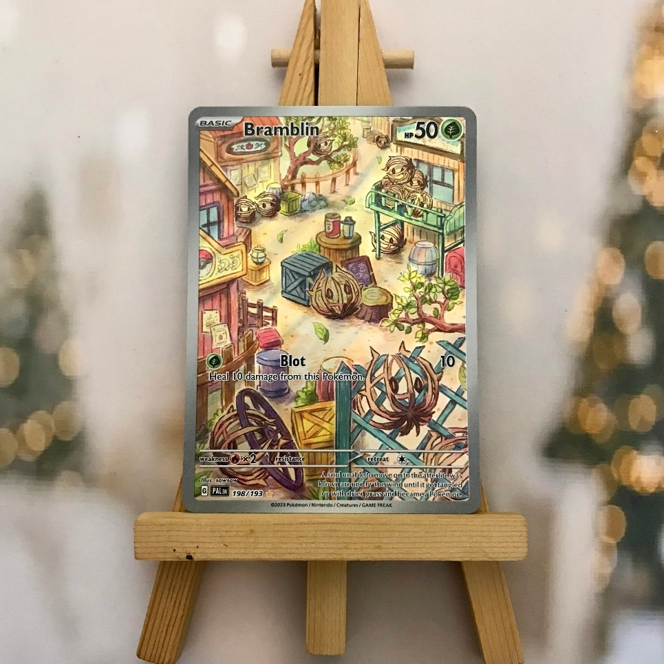 Thẻ hình Pokemon Bramblin 198/193 - Bài lẻ Illustration Rare tiếng Anh chính hãng Nintendo - Nhập khẩu Hoa Kỳ USA ➖➖➖➖➖➖ Sản phẩm chính hãng TCG, được sản xuất bởi The Pokémon Company, nên quý khách có thể yên tâm về chất lượng và độ độc đáo của từng thẻ bài. Chúng tôi cam kết chỉ bán hàng chính hãng và nói không với hàng nhái, hàng giả mạo. Mỗi thẻ bài đều ở trong tình trạng NM-M và sẽ là một phần không thể thiếu cho bộ sưu tập của bạn, giúp bạn có những trải nghiệm thú vị và phong phú. Chất liệu chính của thẻ bài là giấy cao cấp, đảm bảo độ bền và màu sắc sống động, chi tiết. Dòng sản phẩm: TCG Hãng sản xuất: The Pokémon Company Chất liệu: Giấy Kích thước thẻ bài: 6,3×8,8cm ➖➖➖➖➖➖ Thông Báo Hướng Dẫn Bảo Quản và Kiểm Tra Sản Phẩm Thẻ Bài: ✅ Quay Video Khi Mở Kiện: Để đảm bảo quyền lợi, khi nhận sản phẩm, vui lòng quay video quá trình mở kiện. Video này sẽ là bằng chứng đối chiếu quý giá, giúp chúng tôi nhanh chóng giải quyết mọi vấn đề và thắc mắc của bạn. ✅ Mọi sản phẩm như Gói thẻ bài (Pack lẻ), Booster Box, Bộ bài nguyên hộp phải còn nguyên niêm phong và bao bì. Chỉ những sản phẩm còn giữ nguyên vẹn mới được chấp nhận đổi trả hoàn tiền. ✅ Các lá bài chính hãng có thể bị cong khi tiếp xúc với không khí. Đây là hiện tượng bình thường, bạn có thể khắc phục bằng cách sử dụng bọc bài, cất vào album, hoặc ép giữa quyển vở dày. ✅ Một số lá bài có thể xuất hiện các vết trầy xước nhỏ, nhưng không ảnh hưởng đến chất lượng và quá trình sử dụng của bạn. ✅ Chúng tôi không chịu trách nhiệm về nội dung bên trong các gói và hộp thẻ bài do đóng gói và niêm phong từ nhà sản xuất. Mọi thắc mắc và khiếu nại, vui lòng liên hệ trực tiếp với chúng tôi, ➖➖➖➖➖➖