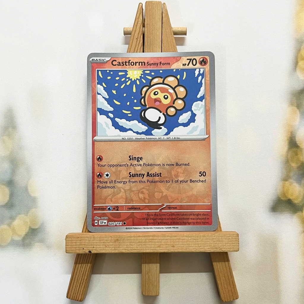 Thẻ hình Pokemon Castform Sunny Form 020/191 - Lá bài lẻ Surging Sparks Common Reverse Holo tiếng Anh chính hãng Nintendo - Nhập khẩu Hoa Kỳ USA ➖➖➖➖➖➖ Sản phẩm chính hãng TCG, được sản xuất bởi The Pokémon Company, nên quý khách có thể yên tâm về chất lượng và độ độc đáo của từng thẻ bài. Chúng tôi cam kết chỉ bán hàng chính hãng và nói không với hàng nhái, hàng giả mạo. Mỗi thẻ bài đều ở trong tình trạng NM-M và sẽ là một phần không thể thiếu cho bộ sưu tập của bạn, giúp bạn có những trải nghiệm thú vị và phong phú. Chất liệu chính của thẻ bài là giấy cao cấp, đảm bảo độ bền và màu sắc sống động, chi tiết. Dòng sản phẩm: TCG Hãng sản xuất: The Pokémon Company Chất liệu: Giấy Kích thước thẻ bài: 6,3×8,8cm ➖➖➖➖➖➖ Thông Báo Hướng Dẫn Bảo Quản và Kiểm Tra Sản Phẩm Thẻ Bài: ✅ Quay Video Khi Mở Kiện: Để đảm bảo quyền lợi, khi nhận sản phẩm, vui lòng quay video quá trình mở kiện. Video này sẽ là bằng chứng đối chiếu quý giá, giúp chúng tôi nhanh chóng giải quyết mọi vấn đề và thắc mắc của bạn. ✅ Mọi sản phẩm như Gói thẻ bài (Pack lẻ), Booster Box, Bộ bài nguyên hộp phải còn nguyên niêm phong và bao bì. Chỉ những sản phẩm còn giữ nguyên vẹn mới được chấp nhận đổi trả hoàn tiền. ✅ Các lá bài chính hãng có thể bị cong khi tiếp xúc với không khí. Đây là hiện tượng bình thường, bạn có thể khắc phục bằng cách sử dụng bọc bài, cất vào album, hoặc ép giữa quyển vở dày. ✅ Một số lá bài có thể xuất hiện các vết trầy xước nhỏ, nhưng không ảnh hưởng đến chất lượng và quá trình sử dụng của bạn. ✅ Chúng tôi không chịu trách nhiệm về nội dung bên trong các gói và hộp thẻ bài do đóng gói và niêm phong từ nhà sản xuất. Mọi thắc mắc và khiếu nại, vui lòng liên hệ trực tiếp với chúng tôi.