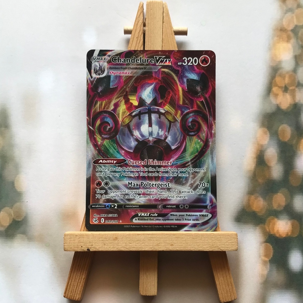 Thẻ hình Pokemon Chandelure VMAX 040/264 - Bài lẻ Ultra Rare tiếng Anh chính hãng Nintendo - Nhập khẩu Hoa Kỳ USA ➖➖➖➖➖➖ Sản phẩm chính hãng TCG, được sản xuất bởi The Pokémon Company, nên quý khách có thể yên tâm về chất lượng và độ độc đáo của từng thẻ bài. Chúng tôi cam kết chỉ bán hàng chính hãng và nói không với hàng nhái, hàng giả mạo. Mỗi thẻ bài đều ở trong tình trạng NM-M và sẽ là một phần không thể thiếu cho bộ sưu tập của bạn, giúp bạn có những trải nghiệm thú vị và phong phú. Chất liệu chính của thẻ bài là giấy cao cấp, đảm bảo độ bền và màu sắc sống động, chi tiết. Dòng sản phẩm: TCG Hãng sản xuất: The Pokémon Company Chất liệu: Giấy Kích thước thẻ bài: 6,3×8,8cm ➖➖➖➖➖➖ Thông Báo Hướng Dẫn Bảo Quản và Kiểm Tra Sản Phẩm Thẻ Bài: ✅ Quay Video Khi Mở Kiện: Để đảm bảo quyền lợi, khi nhận sản phẩm, vui lòng quay video quá trình mở kiện. Video này sẽ là bằng chứng đối chiếu quý giá, giúp chúng tôi nhanh chóng giải quyết mọi vấn đề và thắc mắc của bạn. ✅ Mọi sản phẩm như Gói thẻ bài (Pack lẻ), Booster Box, Bộ bài nguyên hộp phải còn nguyên niêm phong và bao bì. Chỉ những sản phẩm còn giữ nguyên vẹn mới được chấp nhận đổi trả hoàn tiền. ✅ Các lá bài chính hãng có thể bị cong khi tiếp xúc với không khí. Đây là hiện tượng bình thường, bạn có thể khắc phục bằng cách sử dụng bọc bài, cất vào album, hoặc ép giữa quyển vở dày. ✅ Một số lá bài có thể xuất hiện các vết trầy xước nhỏ, nhưng không ảnh hưởng đến chất lượng và quá trình sử dụng của bạn. ✅ Chúng tôi không chịu trách nhiệm về nội dung bên trong các gói và hộp thẻ bài do đóng gói và niêm phong từ nhà sản xuất. Mọi thắc mắc và khiếu nại, vui lòng liên hệ trực tiếp với chúng tôi.