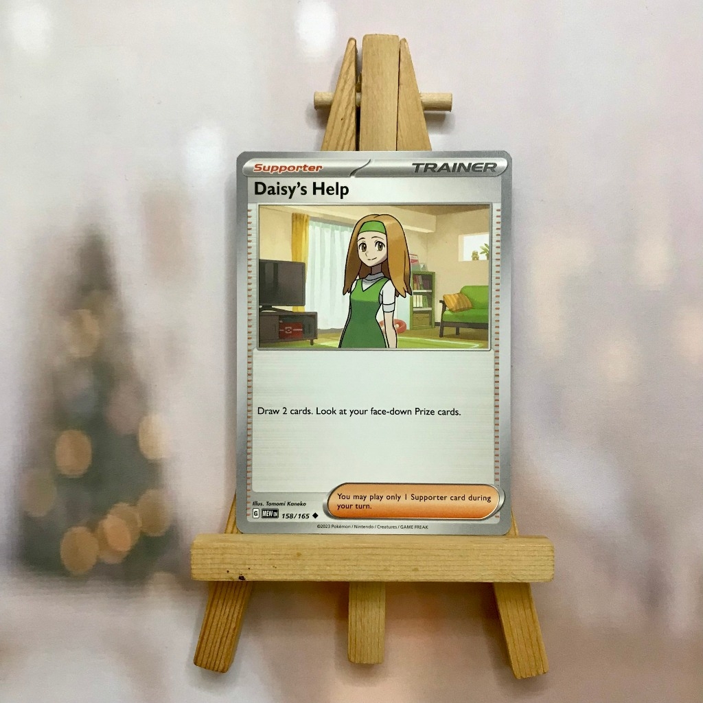 Thẻ hình Pokemon Daisy's Help 158/165 - Lá bài Scarlet & Violet 151 Uncommon Reverse Holo tiếng Anh chính hãng Nintendo - Nhập khẩu Hoa Kỳ USA ➖➖➖➖➖➖ Sản phẩm chính hãng TCG, được sản xuất bởi The Pokémon Company, nên quý khách có thể yên tâm về chất lượng và độ độc đáo của từng thẻ bài. Chúng tôi cam kết chỉ bán hàng chính hãng và nói không với hàng nhái, hàng giả mạo. Mỗi thẻ bài đều ở trong tình trạng NM-M và sẽ là một phần không thể thiếu cho bộ sưu tập của bạn, giúp bạn có những trải nghiệm thú vị và phong phú. Chất liệu chính của thẻ bài là giấy cao cấp, đảm bảo độ bền và màu sắc sống động, chi tiết. Dòng sản phẩm: TCG Hãng sản xuất: The Pokémon Company Chất liệu: Giấy Kích thước thẻ bài: 6,3×8,8cm ➖➖➖➖➖➖ Thông Báo Hướng Dẫn Bảo Quản và Kiểm Tra Sản Phẩm Thẻ Bài: ✅ Quay Video Khi Mở Kiện: Để đảm bảo quyền lợi, khi nhận sản phẩm, vui lòng quay video quá trình mở kiện. Video này sẽ là bằng chứng đối chiếu quý giá, giúp chúng tôi nhanh chóng giải quyết mọi vấn đề và thắc mắc của bạn. ✅ Mọi sản phẩm như Gói thẻ bài (Pack lẻ), Booster Box, Bộ bài nguyên hộp phải còn nguyên niêm phong và bao bì. Chỉ những sản phẩm còn giữ nguyên vẹn mới được chấp nhận đổi trả hoàn tiền. ✅ Các lá bài chính hãng có thể bị cong khi tiếp xúc với không khí. Đây là hiện tượng bình thường, bạn có thể khắc phục bằng cách sử dụng bọc bài, cất vào album, hoặc ép giữa quyển vở dày. ✅ Một số lá bài có thể xuất hiện các vết trầy xước nhỏ, nhưng không ảnh hưởng đến chất lượng và quá trình sử dụng của bạn. ✅ Chúng tôi không chịu trách nhiệm về nội dung bên trong các gói và hộp thẻ bài do đóng gói và niêm phong từ nhà sản xuất. Mọi thắc mắc và khiếu nại, vui lòng liên hệ trực tiếp với chúng tôi.