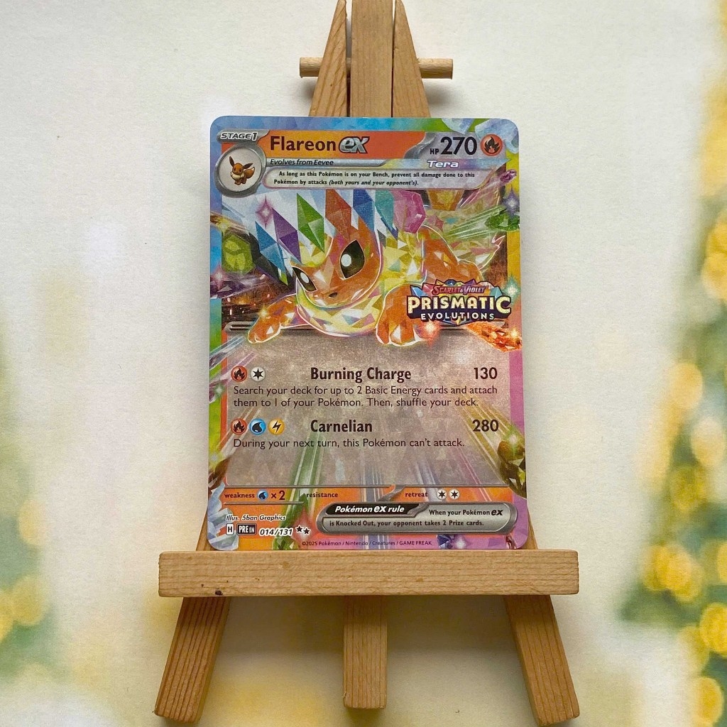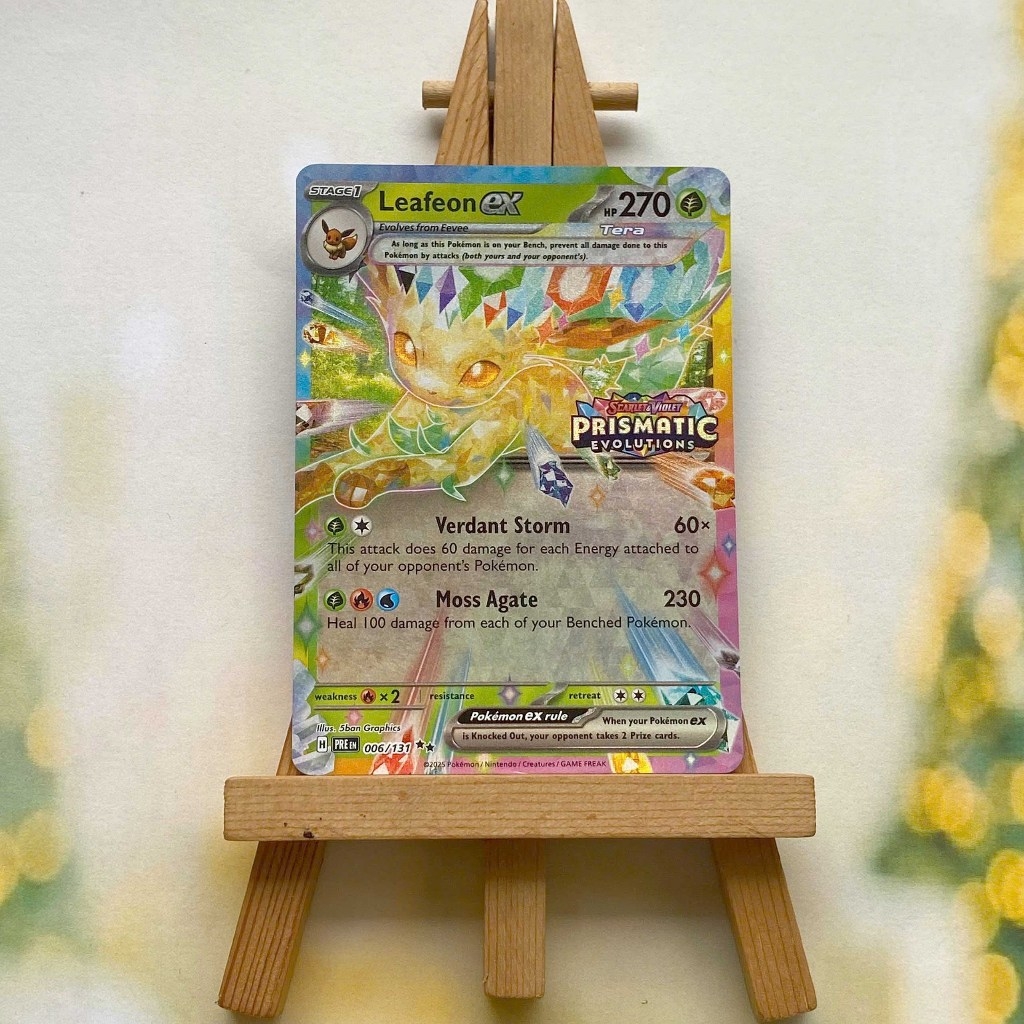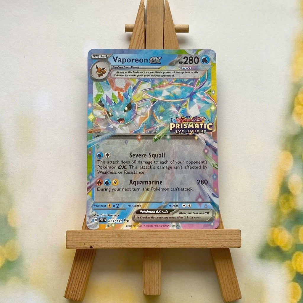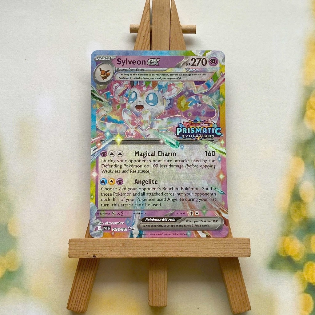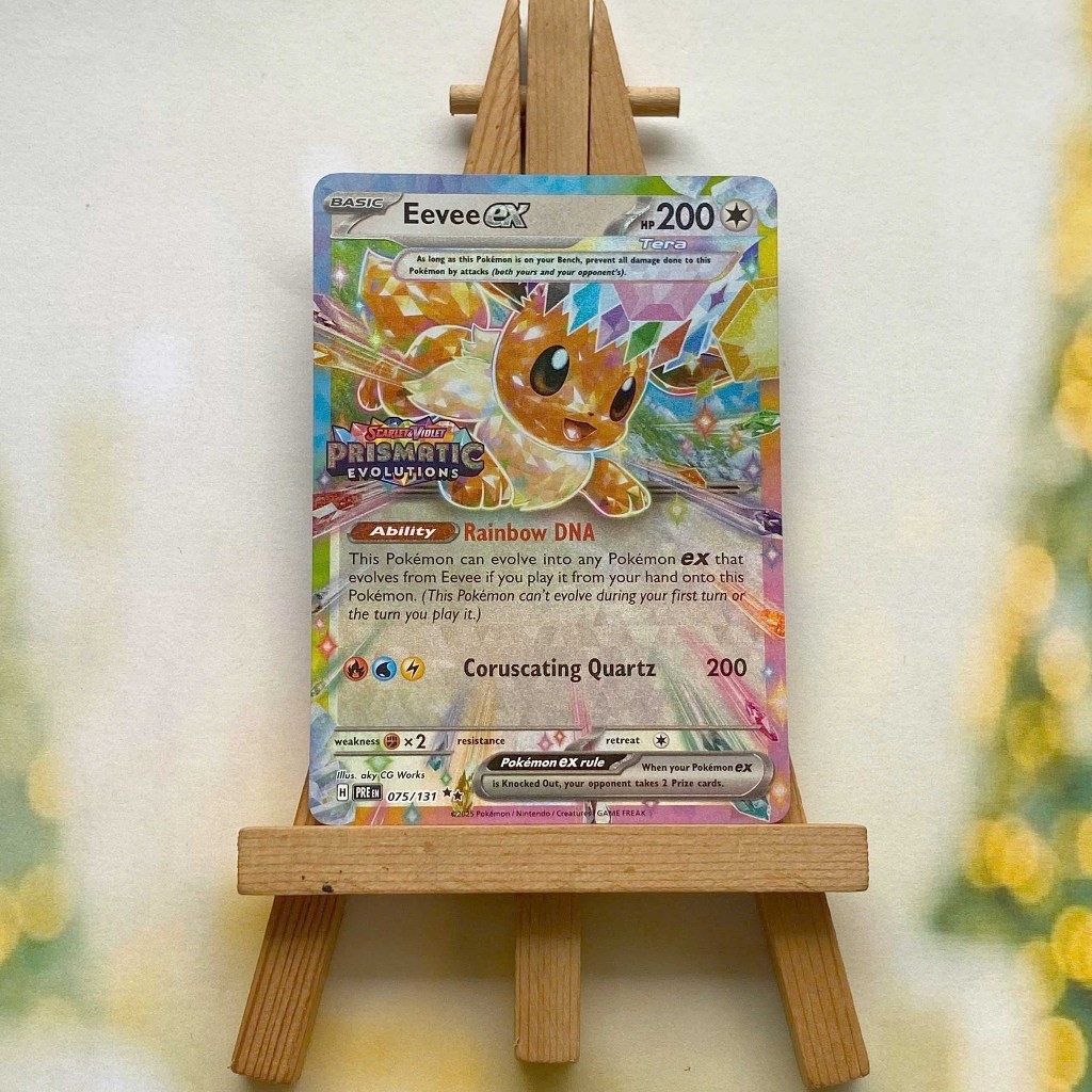 Thẻ hình Pokemon Eevee Ex Promo - Lá bài Eevee Evolves stamp Prismatic Evolution ➖➖➖➖➖➖ Sản phẩm TCG, được sản xuất bởi The Pokémon Company, nên quý khách có thể yên tâm về chất lượng và độ độc đáo của từng thẻ bài. Chúng tôi cam kết nói không với hàng nhái, hàng giả mạo. Mỗi thẻ bài đều ở trong tình trạng NM-M và sẽ là một phần không thể thiếu cho bộ sưu tập của bạn, giúp bạn có những trải nghiệm thú vị và phong phú. Chất liệu chính của thẻ bài là giấy cao cấp, đảm bảo độ bền và màu sắc sống động, chi tiết. Dòng sản phẩm: TCG Hãng sản xuất: The Pokémon Company Chất liệu: Giấy Kích thước thẻ bài: 6,3×8,8cm ➖➖➖➖➖➖ Thông Báo Hướng Dẫn Bảo Quản và Kiểm Tra Sản Phẩm Thẻ Bài: ✅ Quay Video Khi Mở Kiện: Để đảm bảo quyền lợi, khi nhận sản phẩm, vui lòng quay video quá trình mở kiện. Video này sẽ là bằng chứng đối chiếu quý giá, giúp chúng tôi nhanh chóng giải quyết mọi vấn đề và thắc mắc của bạn. ✅ Mọi sản phẩm như Gói thẻ bài (Pack lẻ), Booster Box, Bộ bài nguyên hộp phải còn nguyên niêm phong và bao bì. Chỉ những sản phẩm còn giữ nguyên vẹn mới được chấp nhận đổi trả hoàn tiền. ✅ Các lá bài có thể bị cong khi tiếp xúc với không khí. Đây là hiện tượng bình thường, bạn có thể khắc phục bằng cách sử dụng bọc bài, cất vào album, hoặc ép giữa quyển vở dày. ✅ Một số lá bài có thể xuất hiện các vết trầy xước nhỏ, nhưng không ảnh hưởng đến chất lượng và quá trình sử dụng của bạn. ✅ Chúng tôi không chịu trách nhiệm về nội dung bên trong các gói và hộp thẻ bài do đóng gói và niêm phong từ nhà sản xuất. Mọi thắc mắc và khiếu nại, vui lòng liên hệ trực tiếp với chúng tôi.