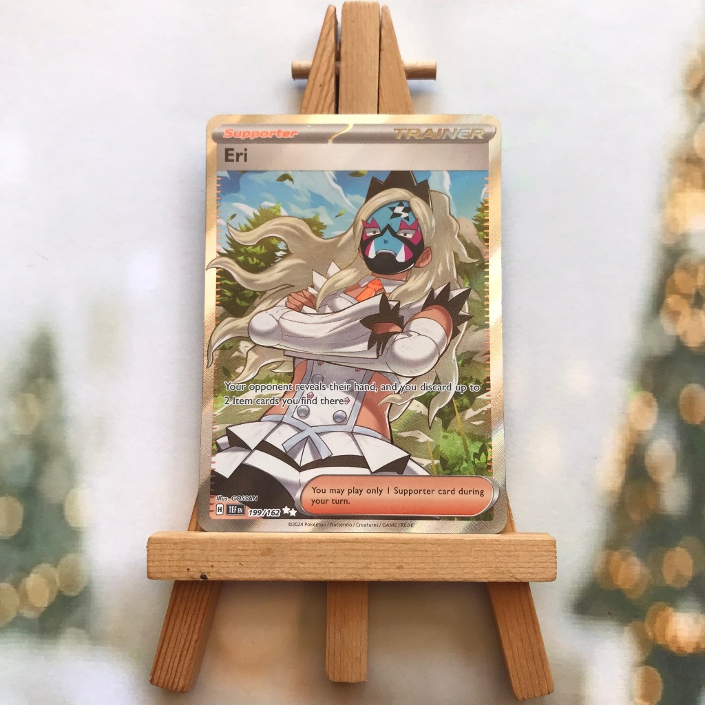 Thẻ hình Pokemon Eri 199/162 - Lá bài lẻ Full Art Secret Rare tiếng Anh chính hãng Nintendo - Nhập khẩu Hoa Kỳ USA ➖➖➖➖➖➖ Sản phẩm chính hãng TCG, được sản xuất bởi The Pokémon Company, nên quý khách có thể yên tâm về chất lượng và độ độc đáo của từng thẻ bài. Chúng tôi cam kết chỉ bán hàng chính hãng và nói không với hàng nhái, hàng giả mạo. Mỗi thẻ bài đều ở trong tình trạng NM-M và sẽ là một phần không thể thiếu cho bộ sưu tập của bạn, giúp bạn có những trải nghiệm thú vị và phong phú. Chất liệu chính của thẻ bài là giấy cao cấp, đảm bảo độ bền và màu sắc sống động, chi tiết. Dòng sản phẩm: TCG Hãng sản xuất: The Pokémon Company Chất liệu: Giấy Kích thước thẻ bài: 6,3×8,8cm ➖➖➖➖➖➖ Thông Báo Hướng Dẫn Bảo Quản và Kiểm Tra Sản Phẩm Thẻ Bài: ✅ Quay Video Khi Mở Kiện: Để đảm bảo quyền lợi, khi nhận sản phẩm, vui lòng quay video quá trình mở kiện. Video này sẽ là bằng chứng đối chiếu quý giá, giúp chúng tôi nhanh chóng giải quyết mọi vấn đề và thắc mắc của bạn. ✅ Mọi sản phẩm như Gói thẻ bài (Pack lẻ), Booster Box, Bộ bài nguyên hộp phải còn nguyên niêm phong và bao bì. Chỉ những sản phẩm còn giữ nguyên vẹn mới được chấp nhận đổi trả hoàn tiền. ✅ Các lá bài chính hãng có thể bị cong khi tiếp xúc với không khí. Đây là hiện tượng bình thường, bạn có thể khắc phục bằng cách sử dụng bọc bài, cất vào album, hoặc ép giữa quyển vở dày. ✅ Một số lá bài có thể xuất hiện các vết trầy xước nhỏ, nhưng không ảnh hưởng đến chất lượng và quá trình sử dụng của bạn. ✅ Chúng tôi không chịu trách nhiệm về nội dung bên trong các gói và hộp thẻ bài do đóng gói và niêm phong từ nhà sản xuất. Mọi thắc mắc và khiếu nại, vui lòng liên hệ trực tiếp với chúng tôi, ➖➖➖➖➖➖