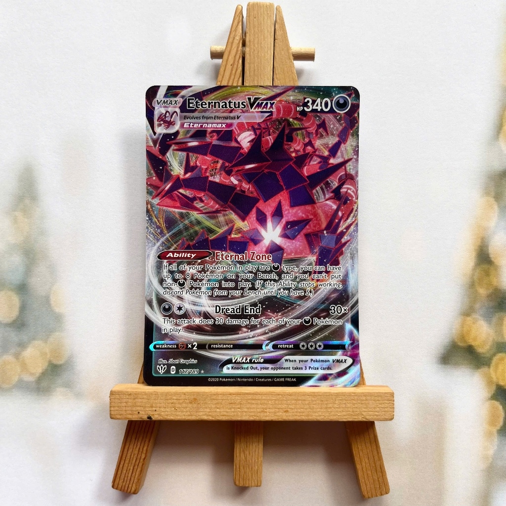Thẻ hình Pokemon Eternatus VMAX 117/189 - Lá bài lẻ Darkness Ablaze Ultra Rare tiếng Anh chính hãng Nintendo - Nhập khẩu Hoa Kỳ USA ➖➖➖➖➖➖ Sản phẩm chính hãng TCG, được sản xuất bởi The Pokémon Company, nên quý khách có thể yên tâm về chất lượng và độ độc đáo của từng thẻ bài. Chúng tôi cam kết chỉ bán hàng chính hãng và nói không với hàng nhái, hàng giả mạo. Mỗi thẻ bài đều ở trong tình trạng NM-M và sẽ là một phần không thể thiếu cho bộ sưu tập của bạn, giúp bạn có những trải nghiệm thú vị và phong phú. Chất liệu chính của thẻ bài là giấy cao cấp, đảm bảo độ bền và màu sắc sống động, chi tiết. Dòng sản phẩm: TCG Hãng sản xuất: The Pokémon Company Chất liệu: Giấy Kích thước thẻ bài: 6,3×8,8cm ➖➖➖➖➖➖ Thông Báo Hướng Dẫn Bảo Quản và Kiểm Tra Sản Phẩm Thẻ Bài: ✅ Quay Video Khi Mở Kiện: Để đảm bảo quyền lợi, khi nhận sản phẩm, vui lòng quay video quá trình mở kiện. Video này sẽ là bằng chứng đối chiếu quý giá, giúp chúng tôi nhanh chóng giải quyết mọi vấn đề và thắc mắc của bạn. ✅ Mọi sản phẩm như Gói thẻ bài (Pack lẻ), Booster Box, Bộ bài nguyên hộp phải còn nguyên niêm phong và bao bì. Chỉ những sản phẩm còn giữ nguyên vẹn mới được chấp nhận đổi trả hoàn tiền. ✅ Các lá bài chính hãng có thể bị cong khi tiếp xúc với không khí. Đây là hiện tượng bình thường, bạn có thể khắc phục bằng cách sử dụng bọc bài, cất vào album, hoặc ép giữa quyển vở dày. ✅ Một số lá bài có thể xuất hiện các vết trầy xước nhỏ, nhưng không ảnh hưởng đến chất lượng và quá trình sử dụng của bạn. ✅ Chúng tôi không chịu trách nhiệm về nội dung bên trong các gói và hộp thẻ bài do đóng gói và niêm phong từ nhà sản xuất. Mọi thắc mắc và khiếu nại, vui lòng liên hệ trực tiếp với chúng tôi.