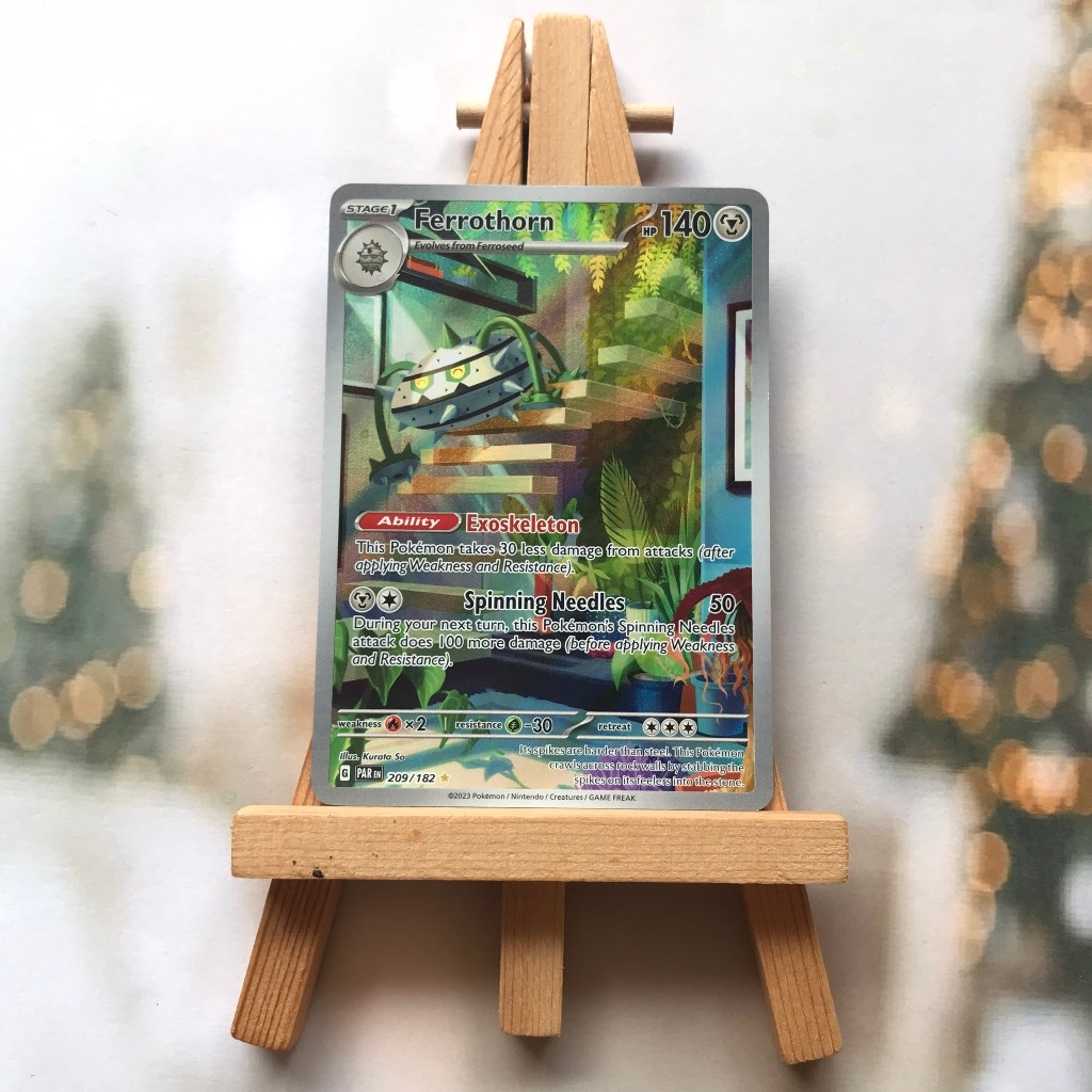 Thẻ hình Pokemon Ferrothorn 209/182 - Bài lẻ Illustration Rare tiếng Anh chính hãng Nintendo - Nhập khẩu Hoa Kỳ USA ➖➖➖➖➖➖ Sản phẩm chính hãng TCG, được sản xuất bởi The Pokémon Company, nên quý khách có thể yên tâm về chất lượng và độ độc đáo của từng thẻ bài. Chúng tôi cam kết chỉ bán hàng chính hãng và nói không với hàng nhái, hàng giả mạo. Mỗi thẻ bài đều ở trong tình trạng NM-M và sẽ là một phần không thể thiếu cho bộ sưu tập của bạn, giúp bạn có những trải nghiệm thú vị và phong phú. Chất liệu chính của thẻ bài là giấy cao cấp, đảm bảo độ bền và màu sắc sống động, chi tiết. Dòng sản phẩm: TCG Hãng sản xuất: The Pokémon Company Chất liệu: Giấy Kích thước thẻ bài: 6,3×8,8cm ➖➖➖➖➖➖ Thông Báo Hướng Dẫn Bảo Quản và Kiểm Tra Sản Phẩm Thẻ Bài: ✅ Quay Video Khi Mở Kiện: Để đảm bảo quyền lợi, khi nhận sản phẩm, vui lòng quay video quá trình mở kiện. Video này sẽ là bằng chứng đối chiếu quý giá, giúp chúng tôi nhanh chóng giải quyết mọi vấn đề và thắc mắc của bạn. ✅ Mọi sản phẩm như Gói thẻ bài (Pack lẻ), Booster Box, Bộ bài nguyên hộp phải còn nguyên niêm phong và bao bì. Chỉ những sản phẩm còn giữ nguyên vẹn mới được chấp nhận đổi trả hoàn tiền. ✅ Các lá bài chính hãng có thể bị cong khi tiếp xúc với không khí. Đây là hiện tượng bình thường, bạn có thể khắc phục bằng cách sử dụng bọc bài, cất vào album, hoặc ép giữa quyển vở dày. ✅ Một số lá bài có thể xuất hiện các vết trầy xước nhỏ, nhưng không ảnh hưởng đến chất lượng và quá trình sử dụng của bạn. ✅ Chúng tôi không chịu trách nhiệm về nội dung bên trong các gói và hộp thẻ bài do đóng gói và niêm phong từ nhà sản xuất. Mọi thắc mắc và khiếu nại, vui lòng liên hệ trực tiếp với chúng tôi, ➖➖➖➖➖➖