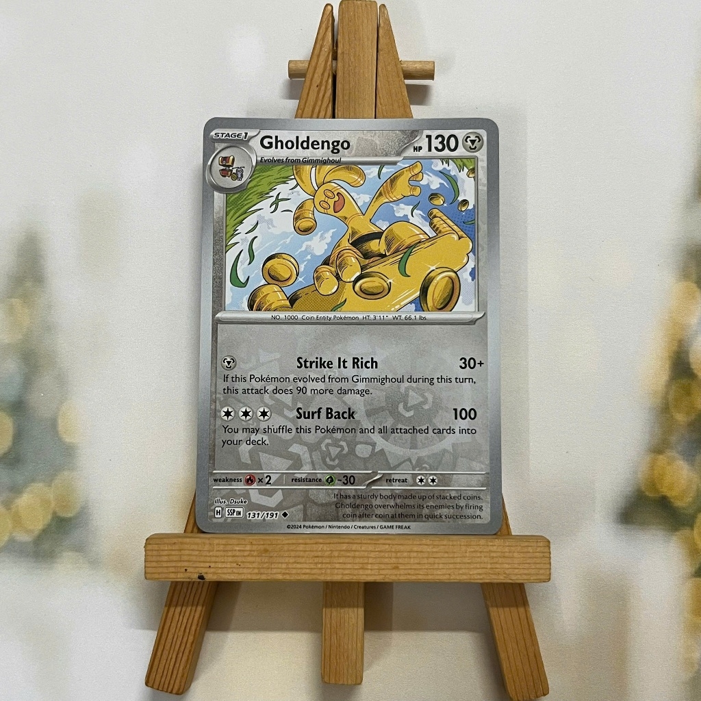 Thẻ hình Pokemon Gholdengo 131/191 - Lá bài lẻ Surging Sparks Uncommon Reverse Holo tiếng Anh chính hãng Nintendo - Nhập khẩu Hoa Kỳ USA ➖➖➖➖➖➖ Sản phẩm chính hãng TCG, được sản xuất bởi The Pokémon Company, nên quý khách có thể yên tâm về chất lượng và độ độc đáo của từng thẻ bài. Chúng tôi cam kết chỉ bán hàng chính hãng và nói không với hàng nhái, hàng giả mạo. Mỗi thẻ bài đều ở trong tình trạng NM-M và sẽ là một phần không thể thiếu cho bộ sưu tập của bạn, giúp bạn có những trải nghiệm thú vị và phong phú. Chất liệu chính của thẻ bài là giấy cao cấp, đảm bảo độ bền và màu sắc sống động, chi tiết. Dòng sản phẩm: TCG Hãng sản xuất: The Pokémon Company Chất liệu: Giấy Kích thước thẻ bài: 6,3×8,8cm ➖➖➖➖➖➖ Thông Báo Hướng Dẫn Bảo Quản và Kiểm Tra Sản Phẩm Thẻ Bài: ✅ Quay Video Khi Mở Kiện: Để đảm bảo quyền lợi, khi nhận sản phẩm, vui lòng quay video quá trình mở kiện. Video này sẽ là bằng chứng đối chiếu quý giá, giúp chúng tôi nhanh chóng giải quyết mọi vấn đề và thắc mắc của bạn. ✅ Mọi sản phẩm như Gói thẻ bài (Pack lẻ), Booster Box, Bộ bài nguyên hộp phải còn nguyên niêm phong và bao bì. Chỉ những sản phẩm còn giữ nguyên vẹn mới được chấp nhận đổi trả hoàn tiền. ✅ Các lá bài chính hãng có thể bị cong khi tiếp xúc với không khí. Đây là hiện tượng bình thường, bạn có thể khắc phục bằng cách sử dụng bọc bài, cất vào album, hoặc ép giữa quyển vở dày. ✅ Một số lá bài có thể xuất hiện các vết trầy xước nhỏ, nhưng không ảnh hưởng đến chất lượng và quá trình sử dụng của bạn. ✅ Chúng tôi không chịu trách nhiệm về nội dung bên trong các gói và hộp thẻ bài do đóng gói và niêm phong từ nhà sản xuất. Mọi thắc mắc và khiếu nại, vui lòng liên hệ trực tiếp với chúng tôi, ➖➖➖➖➖➖