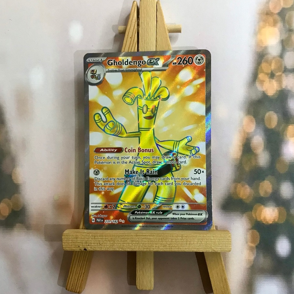 Thẻ hình Pokemon Gholdengo ex 231/182 - Bài lẻ Full Art Secret Rare tiếng Anh chính hãng Nintendo - Nhập khẩu Hoa Kỳ USA ➖➖➖➖➖➖ Sản phẩm chính hãng TCG, được sản xuất bởi The Pokémon Company, nên quý khách có thể yên tâm về chất lượng và độ độc đáo của từng thẻ bài. Chúng tôi cam kết chỉ bán hàng chính hãng và nói không với hàng nhái, hàng giả mạo. Mỗi thẻ bài đều ở trong tình trạng NM-M và sẽ là một phần không thể thiếu cho bộ sưu tập của bạn, giúp bạn có những trải nghiệm thú vị và phong phú. Chất liệu chính của thẻ bài là giấy cao cấp, đảm bảo độ bền và màu sắc sống động, chi tiết. Dòng sản phẩm: TCG Hãng sản xuất: The Pokémon Company Chất liệu: Giấy Kích thước thẻ bài: 6,3×8,8cm ➖➖➖➖➖➖ Thông Báo Hướng Dẫn Bảo Quản và Kiểm Tra Sản Phẩm Thẻ Bài: ✅ Quay Video Khi Mở Kiện: Để đảm bảo quyền lợi, khi nhận sản phẩm, vui lòng quay video quá trình mở kiện. Video này sẽ là bằng chứng đối chiếu quý giá, giúp chúng tôi nhanh chóng giải quyết mọi vấn đề và thắc mắc của bạn. ✅ Mọi sản phẩm như Gói thẻ bài (Pack lẻ), Booster Box, Bộ bài nguyên hộp phải còn nguyên niêm phong và bao bì. Chỉ những sản phẩm còn giữ nguyên vẹn mới được chấp nhận đổi trả hoàn tiền. ✅ Các lá bài chính hãng có thể bị cong khi tiếp xúc với không khí. Đây là hiện tượng bình thường, bạn có thể khắc phục bằng cách sử dụng bọc bài, cất vào album, hoặc ép giữa quyển vở dày. ✅ Một số lá bài có thể xuất hiện các vết trầy xước nhỏ, nhưng không ảnh hưởng đến chất lượng và quá trình sử dụng của bạn. ✅ Chúng tôi không chịu trách nhiệm về nội dung bên trong các gói và hộp thẻ bài do đóng gói và niêm phong từ nhà sản xuất. Mọi thắc mắc và khiếu nại, vui lòng liên hệ trực tiếp với chúng tôi, ➖➖➖➖➖➖