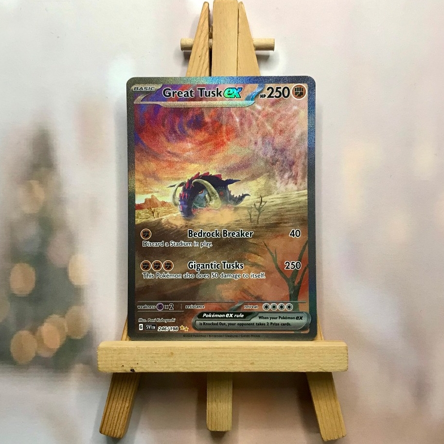 Thẻ hình Pokemon Great Tusk ex 246/198 - Bài lẻ Special Illustration Rare tiếng Anh chính hãng Nintendo - Nhập khẩu Hoa Kỳ USA ➖➖➖➖➖➖ Sản phẩm chính hãng TCG, được sản xuất bởi The Pokémon Company, nên quý khách có thể yên tâm về chất lượng và độ độc đáo của từng thẻ bài. Chúng tôi cam kết chỉ bán hàng chính hãng và nói không với hàng nhái, hàng giả mạo. Mỗi thẻ bài đều ở trong tình trạng NM-M và sẽ là một phần không thể thiếu cho bộ sưu tập của bạn, giúp bạn có những trải nghiệm thú vị và phong phú. Chất liệu chính của thẻ bài là giấy cao cấp, đảm bảo độ bền và màu sắc sống động, chi tiết. Dòng sản phẩm: TCG Hãng sản xuất: The Pokémon Company Chất liệu: Giấy Kích thước thẻ bài: 6,3×8,8cm ➖➖➖➖➖➖ Thông Báo Hướng Dẫn Bảo Quản và Kiểm Tra Sản Phẩm Thẻ Bài: ✅ Quay Video Khi Mở Kiện: Để đảm bảo quyền lợi, khi nhận sản phẩm, vui lòng quay video quá trình mở kiện. Video này sẽ là bằng chứng đối chiếu quý giá, giúp chúng tôi nhanh chóng giải quyết mọi vấn đề và thắc mắc của bạn. ✅ Mọi sản phẩm như Gói thẻ bài (Pack lẻ), Booster Box, Bộ bài nguyên hộp phải còn nguyên niêm phong và bao bì. Chỉ những sản phẩm còn giữ nguyên vẹn mới được chấp nhận đổi trả hoàn tiền. ✅ Các lá bài chính hãng có thể bị cong khi tiếp xúc với không khí. Đây là hiện tượng bình thường, bạn có thể khắc phục bằng cách sử dụng bọc bài, cất vào album, hoặc ép giữa quyển vở dày. ✅ Một số lá bài có thể xuất hiện các vết trầy xước nhỏ, nhưng không ảnh hưởng đến chất lượng và quá trình sử dụng của bạn. ✅ Chúng tôi không chịu trách nhiệm về nội dung bên trong các gói và hộp thẻ bài do đóng gói và niêm phong từ nhà sản xuất. Mọi thắc mắc và khiếu nại, vui lòng liên hệ trực tiếp với chúng tôi, ➖➖➖➖➖➖