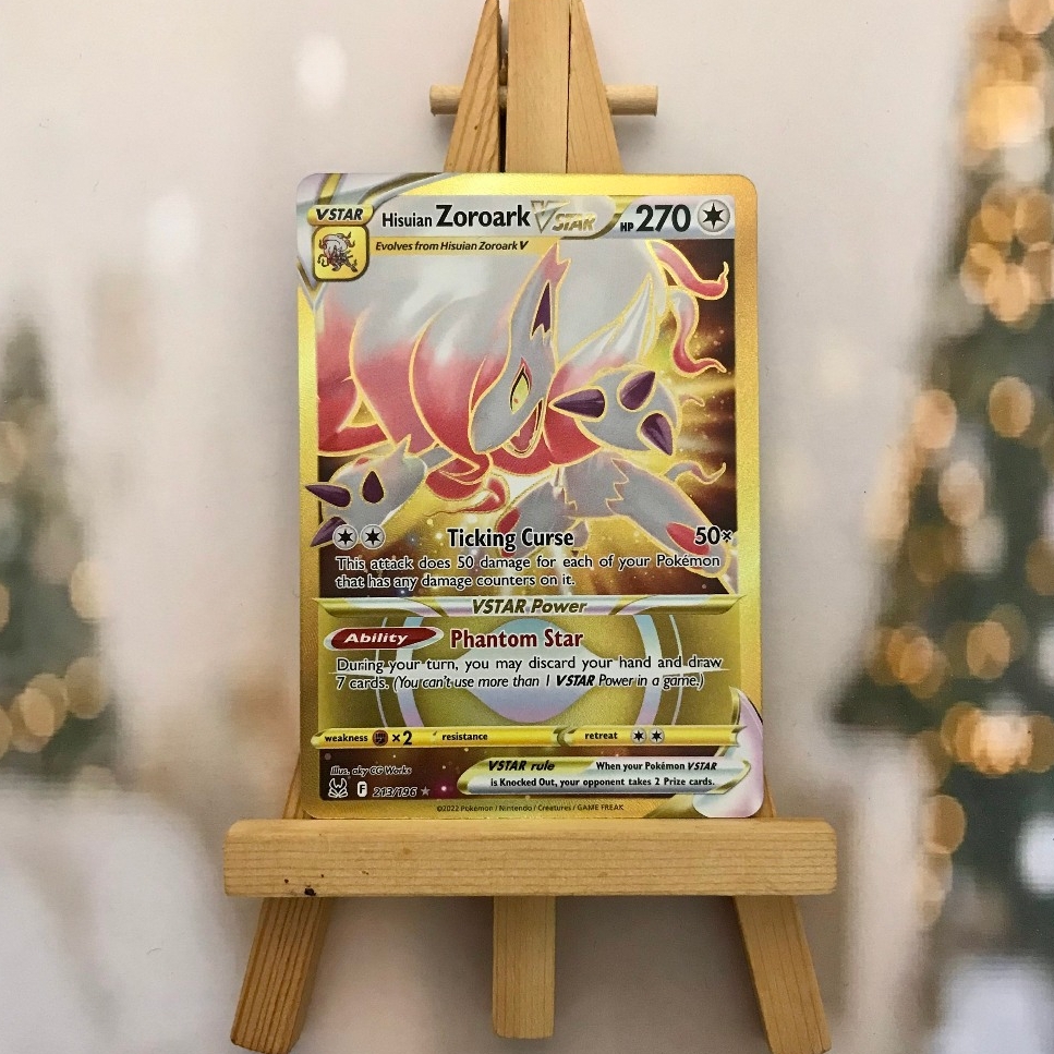 Thẻ hình Pokemon Hisuian Zoroark VSTAR 213/196 - Bài lẻ Secret Rare tiếng Anh chính hãng Nintendo - Nhập khẩu Hoa Kỳ USA ➖➖➖➖➖➖ Sản phẩm chính hãng TCG, được sản xuất bởi The Pokémon Company, nên quý khách có thể yên tâm về chất lượng và độ độc đáo của từng thẻ bài. Chúng tôi cam kết chỉ bán hàng chính hãng và nói không với hàng nhái, hàng giả mạo. Mỗi thẻ bài đều ở trong tình trạng NM-M và sẽ là một phần không thể thiếu cho bộ sưu tập của bạn, giúp bạn có những trải nghiệm thú vị và phong phú. Chất liệu chính của thẻ bài là giấy cao cấp, đảm bảo độ bền và màu sắc sống động, chi tiết. Dòng sản phẩm: TCG Hãng sản xuất: The Pokémon Company Chất liệu: Giấy Kích thước thẻ bài: 6,3×8,8cm ➖➖➖➖➖➖ Thông Báo Hướng Dẫn Bảo Quản và Kiểm Tra Sản Phẩm Thẻ Bài: ✅ Quay Video Khi Mở Kiện: Để đảm bảo quyền lợi, khi nhận sản phẩm, vui lòng quay video quá trình mở kiện. Video này sẽ là bằng chứng đối chiếu quý giá, giúp chúng tôi nhanh chóng giải quyết mọi vấn đề và thắc mắc của bạn. ✅ Mọi sản phẩm như Gói thẻ bài (Pack lẻ), Booster Box, Bộ bài nguyên hộp phải còn nguyên niêm phong và bao bì. Chỉ những sản phẩm còn giữ nguyên vẹn mới được chấp nhận đổi trả hoàn tiền. ✅ Các lá bài chính hãng có thể bị cong khi tiếp xúc với không khí. Đây là hiện tượng bình thường, bạn có thể khắc phục bằng cách sử dụng bọc bài, cất vào album, hoặc ép giữa quyển vở dày. ✅ Một số lá bài có thể xuất hiện các vết trầy xước nhỏ, nhưng không ảnh hưởng đến chất lượng và quá trình sử dụng của bạn. ✅ Chúng tôi không chịu trách nhiệm về nội dung bên trong các gói và hộp thẻ bài do đóng gói và niêm phong từ nhà sản xuất. Mọi thắc mắc và khiếu nại, vui lòng liên hệ trực tiếp với chúng tôi, ➖➖➖➖➖➖