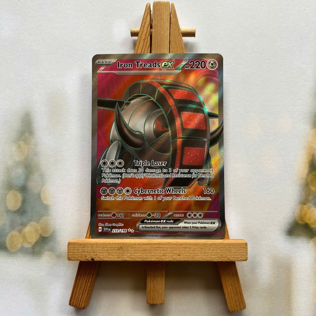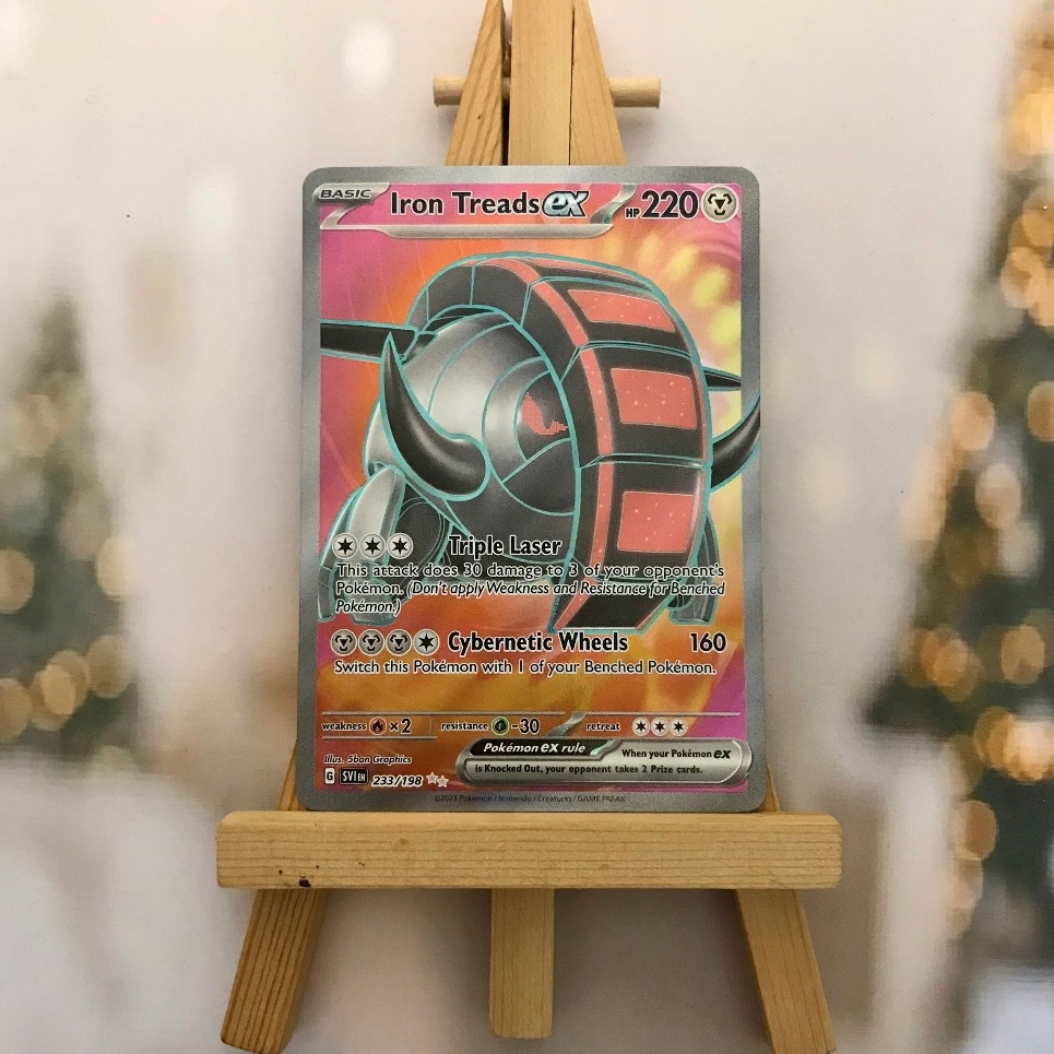 Thẻ hình Pokemon Iron Treads ex 233/198 - Bài lẻ Full Art Secret Rare tiếng Anh chính hãng Nintendo - Nhập khẩu Hoa Kỳ USA ➖➖➖➖➖➖ Sản phẩm chính hãng TCG, được sản xuất bởi The Pokémon Company, nên quý khách có thể yên tâm về chất lượng và độ độc đáo của từng thẻ bài. Chúng tôi cam kết chỉ bán hàng chính hãng và nói không với hàng nhái, hàng giả mạo. Mỗi thẻ bài đều ở trong tình trạng NM-M và sẽ là một phần không thể thiếu cho bộ sưu tập của bạn, giúp bạn có những trải nghiệm thú vị và phong phú. Chất liệu chính của thẻ bài là giấy cao cấp, đảm bảo độ bền và màu sắc sống động, chi tiết. Dòng sản phẩm: TCG Hãng sản xuất: The Pokémon Company Chất liệu: Giấy Kích thước thẻ bài: 6,3×8,8cm ➖➖➖➖➖➖ Thông Báo Hướng Dẫn Bảo Quản và Kiểm Tra Sản Phẩm Thẻ Bài: ✅ Quay Video Khi Mở Kiện: Để đảm bảo quyền lợi, khi nhận sản phẩm, vui lòng quay video quá trình mở kiện. Video này sẽ là bằng chứng đối chiếu quý giá, giúp chúng tôi nhanh chóng giải quyết mọi vấn đề và thắc mắc của bạn. ✅ Mọi sản phẩm như Gói thẻ bài (Pack lẻ), Booster Box, Bộ bài nguyên hộp phải còn nguyên niêm phong và bao bì. Chỉ những sản phẩm còn giữ nguyên vẹn mới được chấp nhận đổi trả hoàn tiền. ✅ Các lá bài chính hãng có thể bị cong khi tiếp xúc với không khí. Đây là hiện tượng bình thường, bạn có thể khắc phục bằng cách sử dụng bọc bài, cất vào album, hoặc ép giữa quyển vở dày. ✅ Một số lá bài có thể xuất hiện các vết trầy xước nhỏ, nhưng không ảnh hưởng đến chất lượng và quá trình sử dụng của bạn. ✅ Chúng tôi không chịu trách nhiệm về nội dung bên trong các gói và hộp thẻ bài do đóng gói và niêm phong từ nhà sản xuất. Mọi thắc mắc và khiếu nại, vui lòng liên hệ trực tiếp với chúng tôi, ➖➖➖➖➖➖