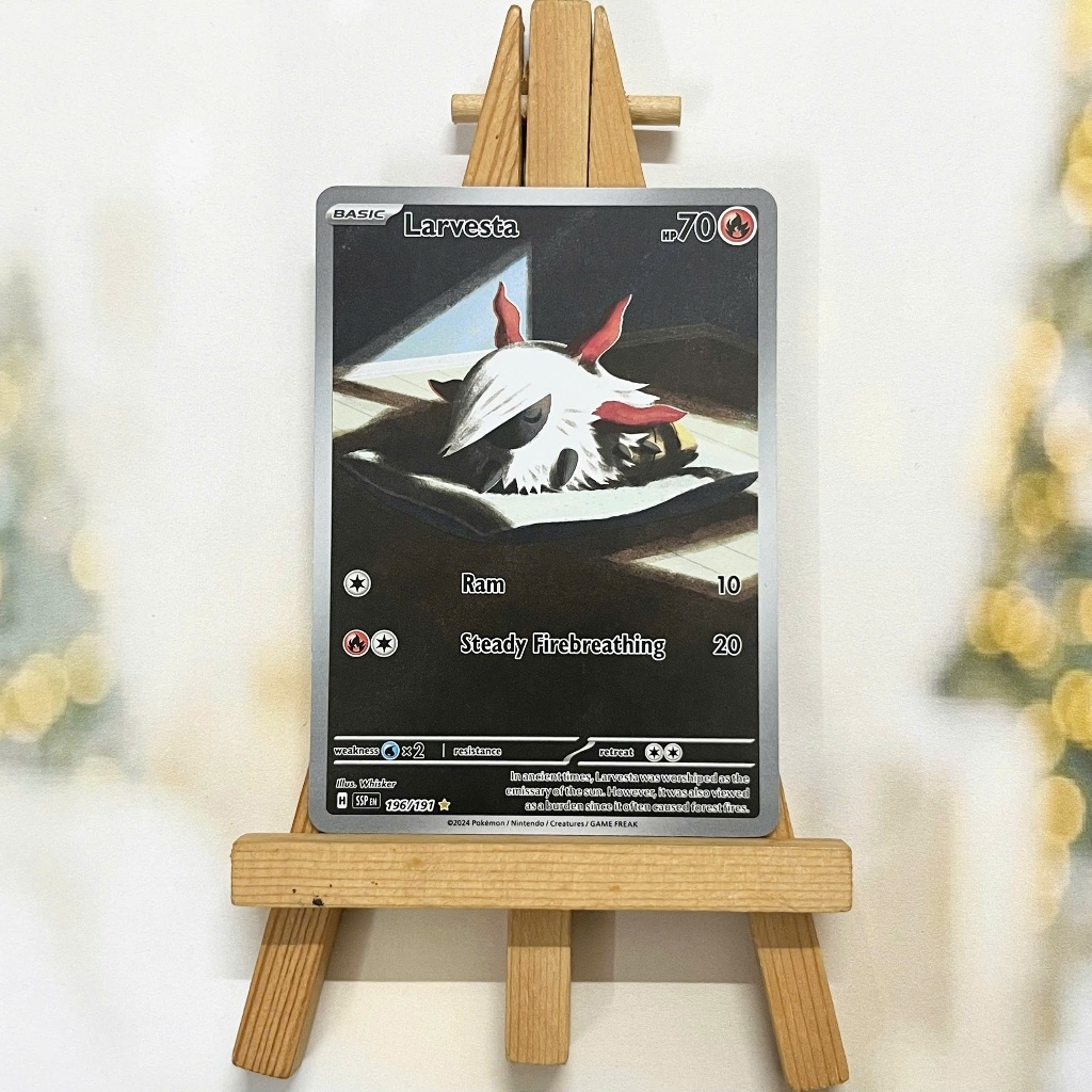 Thẻ hình Pokemon Larvesta 196/191 - Lá bài lẻ Surging Sparks Illustration Rare tiếng Anh chính hãng Nintendo - Nhập khẩu Hoa Kỳ USA ➖➖➖➖➖➖ Sản phẩm chính hãng TCG, được sản xuất bởi The Pokémon Company, nên quý khách có thể yên tâm về chất lượng và độ độc đáo của từng thẻ bài. Chúng tôi cam kết chỉ bán hàng chính hãng và nói không với hàng nhái, hàng giả mạo. Mỗi thẻ bài đều ở trong tình trạng NM-M và sẽ là một phần không thể thiếu cho bộ sưu tập của bạn, giúp bạn có những trải nghiệm thú vị và phong phú. Chất liệu chính của thẻ bài là giấy cao cấp, đảm bảo độ bền và màu sắc sống động, chi tiết. Dòng sản phẩm: TCG Hãng sản xuất: The Pokémon Company Chất liệu: Giấy Kích thước thẻ bài: 6,3×8,8cm ➖➖➖➖➖➖ Thông Báo Hướng Dẫn Bảo Quản và Kiểm Tra Sản Phẩm Thẻ Bài: ✅ Quay Video Khi Mở Kiện: Để đảm bảo quyền lợi, khi nhận sản phẩm, vui lòng quay video quá trình mở kiện. Video này sẽ là bằng chứng đối chiếu quý giá, giúp chúng tôi nhanh chóng giải quyết mọi vấn đề và thắc mắc của bạn. ✅ Mọi sản phẩm như Gói thẻ bài (Pack lẻ), Booster Box, Bộ bài nguyên hộp phải còn nguyên niêm phong và bao bì. Chỉ những sản phẩm còn giữ nguyên vẹn mới được chấp nhận đổi trả hoàn tiền. ✅ Các lá bài chính hãng có thể bị cong khi tiếp xúc với không khí. Đây là hiện tượng bình thường, bạn có thể khắc phục bằng cách sử dụng bọc bài, cất vào album, hoặc ép giữa quyển vở dày. ✅ Một số lá bài có thể xuất hiện các vết trầy xước nhỏ, nhưng không ảnh hưởng đến chất lượng và quá trình sử dụng của bạn. ✅ Chúng tôi không chịu trách nhiệm về nội dung bên trong các gói và hộp thẻ bài do đóng gói và niêm phong từ nhà sản xuất. Mọi thắc mắc và khiếu nại, vui lòng liên hệ trực tiếp với chúng tôi, ➖➖➖➖➖➖