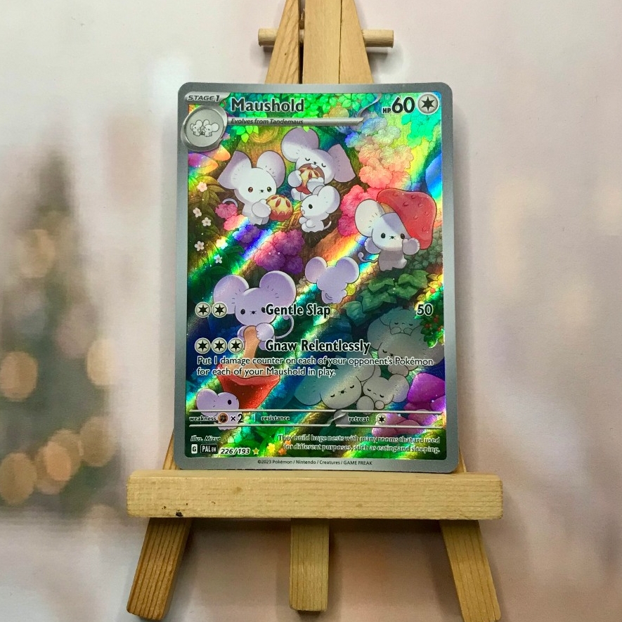 Thẻ hình Pokemon Maushold 226/193 - Bài lẻ Illustration Rare tiếng Anh chính hãng Nintendo - Nhập khẩu Hoa Kỳ USA ➖➖➖➖➖➖ Sản phẩm chính hãng TCG, được sản xuất bởi The Pokémon Company, nên quý khách có thể yên tâm về chất lượng và độ độc đáo của từng thẻ bài. Chúng tôi cam kết chỉ bán hàng chính hãng và nói không với hàng nhái, hàng giả mạo. Mỗi thẻ bài đều ở trong tình trạng NM-M và sẽ là một phần không thể thiếu cho bộ sưu tập của bạn, giúp bạn có những trải nghiệm thú vị và phong phú. Chất liệu chính của thẻ bài là giấy cao cấp, đảm bảo độ bền và màu sắc sống động, chi tiết. Dòng sản phẩm: TCG Hãng sản xuất: The Pokémon Company Chất liệu: Giấy Kích thước thẻ bài: 6,3×8,8cm ➖➖➖➖➖➖ Thông Báo Hướng Dẫn Bảo Quản và Kiểm Tra Sản Phẩm Thẻ Bài: ✅ Quay Video Khi Mở Kiện: Để đảm bảo quyền lợi, khi nhận sản phẩm, vui lòng quay video quá trình mở kiện. Video này sẽ là bằng chứng đối chiếu quý giá, giúp chúng tôi nhanh chóng giải quyết mọi vấn đề và thắc mắc của bạn. ✅ Mọi sản phẩm như Gói thẻ bài (Pack lẻ), Booster Box, Bộ bài nguyên hộp phải còn nguyên niêm phong và bao bì. Chỉ những sản phẩm còn giữ nguyên vẹn mới được chấp nhận đổi trả hoàn tiền. ✅ Các lá bài chính hãng có thể bị cong khi tiếp xúc với không khí. Đây là hiện tượng bình thường, bạn có thể khắc phục bằng cách sử dụng bọc bài, cất vào album, hoặc ép giữa quyển vở dày. ✅ Một số lá bài có thể xuất hiện các vết trầy xước nhỏ, nhưng không ảnh hưởng đến chất lượng và quá trình sử dụng của bạn. ✅ Chúng tôi không chịu trách nhiệm về nội dung bên trong các gói và hộp thẻ bài do đóng gói và niêm phong từ nhà sản xuất. Mọi thắc mắc và khiếu nại, vui lòng liên hệ trực tiếp với chúng tôi, ➖➖➖➖➖➖