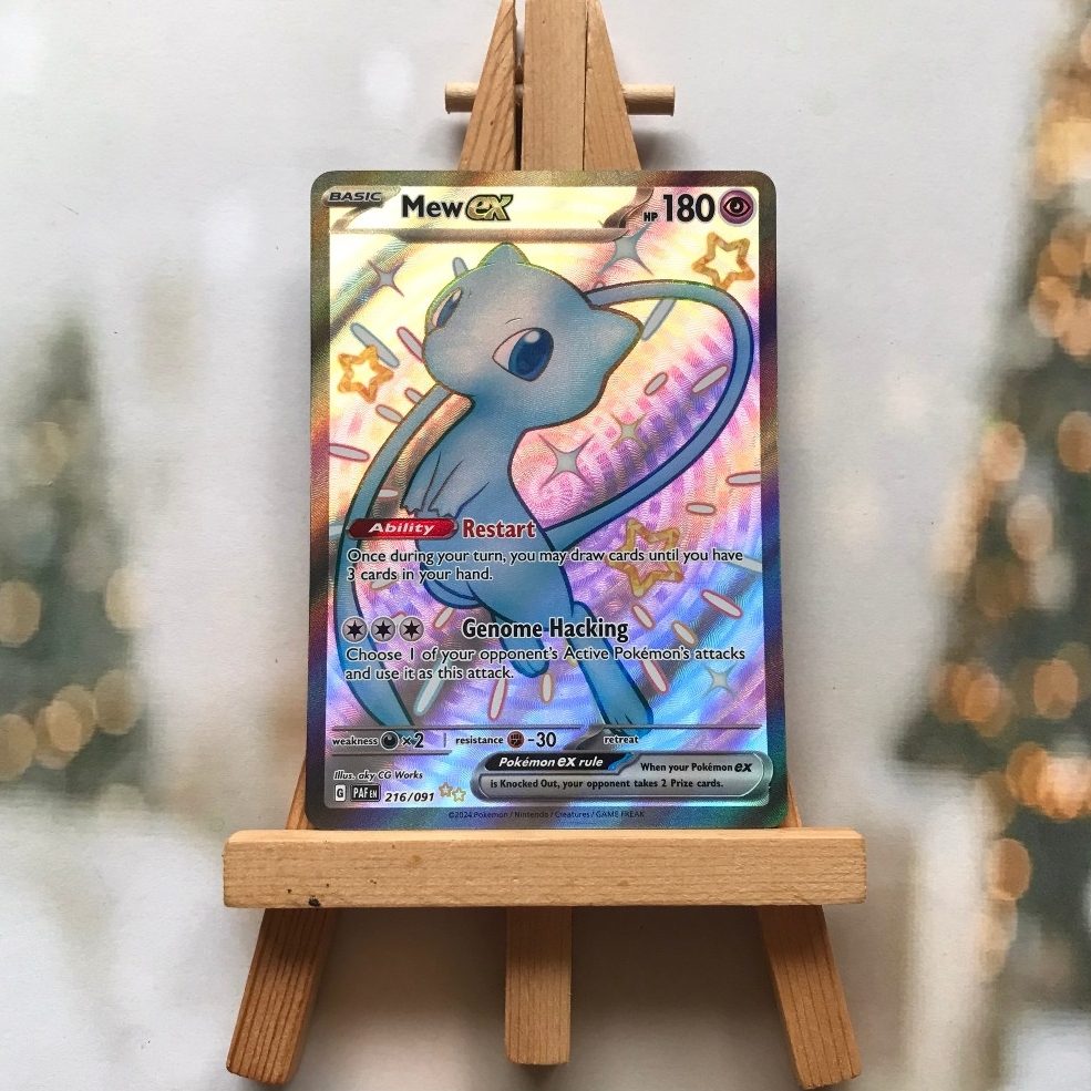 Thẻ hình Pokemon Mew ex 216/091 - Bài lẻ Shiny Ultra Rare tiếng Anh chính hãng Nintendo - Nhập khẩu Hoa Kỳ USA ➖➖➖➖➖➖ Sản phẩm chính hãng TCG, được sản xuất bởi The Pokémon Company, nên quý khách có thể yên tâm về chất lượng và độ độc đáo của từng thẻ bài. Chúng tôi cam kết chỉ bán hàng chính hãng và nói không với hàng nhái, hàng giả mạo. Mỗi thẻ bài đều ở trong tình trạng NM-M và sẽ là một phần không thể thiếu cho bộ sưu tập của bạn, giúp bạn có những trải nghiệm thú vị và phong phú. Chất liệu chính của thẻ bài là giấy cao cấp, đảm bảo độ bền và màu sắc sống động, chi tiết. Dòng sản phẩm: TCG Hãng sản xuất: The Pokémon Company Chất liệu: Giấy Kích thước thẻ bài: 6,3×8,8cm ➖➖➖➖➖➖ Thông Báo Hướng Dẫn Bảo Quản và Kiểm Tra Sản Phẩm Thẻ Bài: ✅ Quay Video Khi Mở Kiện: Để đảm bảo quyền lợi, khi nhận sản phẩm, vui lòng quay video quá trình mở kiện. Video này sẽ là bằng chứng đối chiếu quý giá, giúp chúng tôi nhanh chóng giải quyết mọi vấn đề và thắc mắc của bạn. ✅ Mọi sản phẩm như Gói thẻ bài (Pack lẻ), Booster Box, Bộ bài nguyên hộp phải còn nguyên niêm phong và bao bì. Chỉ những sản phẩm còn giữ nguyên vẹn mới được chấp nhận đổi trả hoàn tiền. ✅ Các lá bài chính hãng có thể bị cong khi tiếp xúc với không khí. Đây là hiện tượng bình thường, bạn có thể khắc phục bằng cách sử dụng bọc bài, cất vào album, hoặc ép giữa quyển vở dày. ✅ Một số lá bài có thể xuất hiện các vết trầy xước nhỏ, nhưng không ảnh hưởng đến chất lượng và quá trình sử dụng của bạn. ✅ Chúng tôi không chịu trách nhiệm về nội dung bên trong các gói và hộp thẻ bài do đóng gói và niêm phong từ nhà sản xuất. Mọi thắc mắc và khiếu nại, vui lòng liên hệ trực tiếp với chúng tôi, ➖➖➖➖➖➖