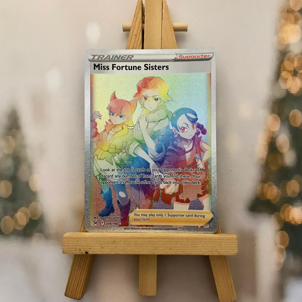 Thẻ hình Pokemon Miss Fortune Sisters 209/196 - Bài lẻ Hyper Rare tiếng Anh chính hãng Nintendo - Nhập khẩu Hoa Kỳ USA ➖➖➖➖➖➖ Sản phẩm chính hãng TCG, được sản xuất bởi The Pokémon Company, nên quý khách có thể yên tâm về chất lượng và độ độc đáo của từng thẻ bài. Chúng tôi cam kết chỉ bán hàng chính hãng và nói không với hàng nhái, hàng giả mạo. Mỗi thẻ bài đều ở trong tình trạng NM-M và sẽ là một phần không thể thiếu cho bộ sưu tập của bạn, giúp bạn có những trải nghiệm thú vị và phong phú. Chất liệu chính của thẻ bài là giấy cao cấp, đảm bảo độ bền và màu sắc sống động, chi tiết. Dòng sản phẩm: TCG Hãng sản xuất: The Pokémon Company Chất liệu: Giấy Kích thước thẻ bài: 6,3×8,8cm ➖➖➖➖➖➖ Thông Báo Hướng Dẫn Bảo Quản và Kiểm Tra Sản Phẩm Thẻ Bài: ✅ Quay Video Khi Mở Kiện: Để đảm bảo quyền lợi, khi nhận sản phẩm, vui lòng quay video quá trình mở kiện. Video này sẽ là bằng chứng đối chiếu quý giá, giúp chúng tôi nhanh chóng giải quyết mọi vấn đề và thắc mắc của bạn. ✅ Mọi sản phẩm như Gói thẻ bài (Pack lẻ), Booster Box, Bộ bài nguyên hộp phải còn nguyên niêm phong và bao bì. Chỉ những sản phẩm còn giữ nguyên vẹn mới được chấp nhận đổi trả hoàn tiền. ✅ Các lá bài chính hãng có thể bị cong khi tiếp xúc với không khí. Đây là hiện tượng bình thường, bạn có thể khắc phục bằng cách sử dụng bọc bài, cất vào album, hoặc ép giữa quyển vở dày. ✅ Một số lá bài có thể xuất hiện các vết trầy xước nhỏ, nhưng không ảnh hưởng đến chất lượng và quá trình sử dụng của bạn. ✅ Chúng tôi không chịu trách nhiệm về nội dung bên trong các gói và hộp thẻ bài do đóng gói và niêm phong từ nhà sản xuất. Mọi thắc mắc và khiếu nại, vui lòng liên hệ trực tiếp với chúng tôi, ➖➖➖➖➖➖