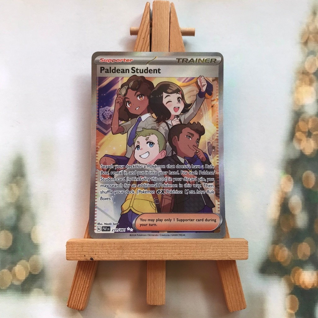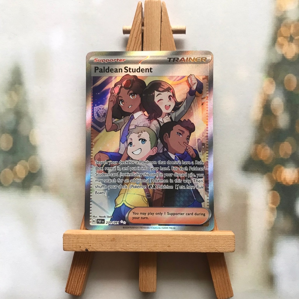 Thẻ hình Pokemon Paldean Student 231/091 - Lá bài Scarlet & Violet: Paldean Fates Illustration Rare tiếng Anh chính hãng Nintendo - Nhập khẩu Hoa Kỳ USA ➖➖➖➖➖➖ Sản phẩm chính hãng TCG, được sản xuất bởi The Pokémon Company, nên quý khách có thể yên tâm về chất lượng và độ độc đáo của từng thẻ bài. Chúng tôi cam kết chỉ bán hàng chính hãng và nói không với hàng nhái, hàng giả mạo. Mỗi thẻ bài đều ở trong tình trạng NM-M và sẽ là một phần không thể thiếu cho bộ sưu tập của bạn, giúp bạn có những trải nghiệm thú vị và phong phú. Chất liệu chính của thẻ bài là giấy cao cấp, đảm bảo độ bền và màu sắc sống động, chi tiết. Dòng sản phẩm: TCG Hãng sản xuất: The Pokémon Company Chất liệu: Giấy Kích thước thẻ bài: 6,3×8,8cm ➖➖➖➖➖➖ Thông Báo Hướng Dẫn Bảo Quản và Kiểm Tra Sản Phẩm Thẻ Bài: ✅ Quay Video Khi Mở Kiện: Để đảm bảo quyền lợi, khi nhận sản phẩm, vui lòng quay video quá trình mở kiện. Video này sẽ là bằng chứng đối chiếu quý giá, giúp chúng tôi nhanh chóng giải quyết mọi vấn đề và thắc mắc của bạn. ✅ Mọi sản phẩm như Gói thẻ bài (Pack lẻ), Booster Box, Bộ bài nguyên hộp phải còn nguyên niêm phong và bao bì. Chỉ những sản phẩm còn giữ nguyên vẹn mới được chấp nhận đổi trả hoàn tiền. ✅ Các lá bài chính hãng có thể bị cong khi tiếp xúc với không khí. Đây là hiện tượng bình thường, bạn có thể khắc phục bằng cách sử dụng bọc bài, cất vào album, hoặc ép giữa quyển vở dày. ✅ Một số lá bài có thể xuất hiện các vết trầy xước nhỏ, nhưng không ảnh hưởng đến chất lượng và quá trình sử dụng của bạn. ✅ Chúng tôi không chịu trách nhiệm về nội dung bên trong các gói và hộp thẻ bài do đóng gói và niêm phong từ nhà sản xuất. Mọi thắc mắc và khiếu nại, vui lòng liên hệ trực tiếp với chúng tôi, ➖➖➖➖➖➖