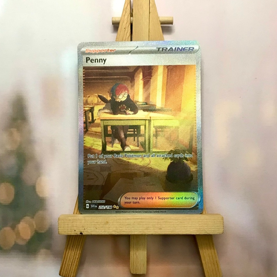 Thẻ hình Pokemon Penny 252/198 - Bài lẻ Special Illustration Rare tiếng Anh chính hãng Nintendo - Nhập khẩu Hoa Kỳ USA ➖➖➖➖➖➖ Sản phẩm chính hãng TCG, được sản xuất bởi The Pokémon Company, nên quý khách có thể yên tâm về chất lượng và độ độc đáo của từng thẻ bài. Chúng tôi cam kết chỉ bán hàng chính hãng và nói không với hàng nhái, hàng giả mạo. Mỗi thẻ bài đều ở trong tình trạng NM-M và sẽ là một phần không thể thiếu cho bộ sưu tập của bạn, giúp bạn có những trải nghiệm thú vị và phong phú. Chất liệu chính của thẻ bài là giấy cao cấp, đảm bảo độ bền và màu sắc sống động, chi tiết. Dòng sản phẩm: TCG Hãng sản xuất: The Pokémon Company Chất liệu: Giấy Kích thước thẻ bài: 6,3×8,8cm ➖➖➖➖➖➖ Thông Báo Hướng Dẫn Bảo Quản và Kiểm Tra Sản Phẩm Thẻ Bài: ✅ Quay Video Khi Mở Kiện: Để đảm bảo quyền lợi, khi nhận sản phẩm, vui lòng quay video quá trình mở kiện. Video này sẽ là bằng chứng đối chiếu quý giá, giúp chúng tôi nhanh chóng giải quyết mọi vấn đề và thắc mắc của bạn. ✅ Mọi sản phẩm như Gói thẻ bài (Pack lẻ), Booster Box, Bộ bài nguyên hộp phải còn nguyên niêm phong và bao bì. Chỉ những sản phẩm còn giữ nguyên vẹn mới được chấp nhận đổi trả hoàn tiền. ✅ Các lá bài chính hãng có thể bị cong khi tiếp xúc với không khí. Đây là hiện tượng bình thường, bạn có thể khắc phục bằng cách sử dụng bọc bài, cất vào album, hoặc ép giữa quyển vở dày. ✅ Một số lá bài có thể xuất hiện các vết trầy xước nhỏ, nhưng không ảnh hưởng đến chất lượng và quá trình sử dụng của bạn. ✅ Chúng tôi không chịu trách nhiệm về nội dung bên trong các gói và hộp thẻ bài do đóng gói và niêm phong từ nhà sản xuất. Mọi thắc mắc và khiếu nại, vui lòng liên hệ trực tiếp với chúng tôi, ➖➖➖➖➖➖