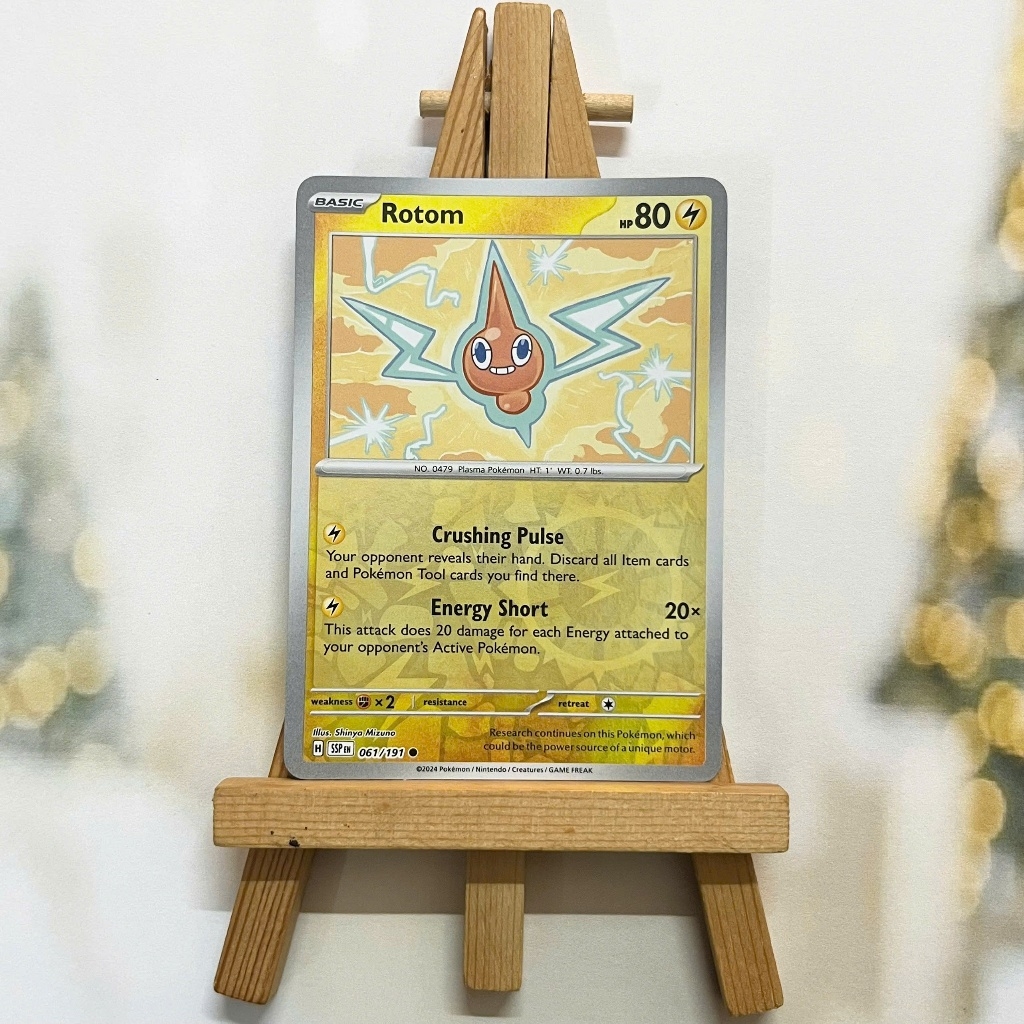 Thẻ hình Pokemon Rotom 061/191 - Lá bài lẻ Surging Sparks Common Reverse Holo tiếng Anh chính hãng Nintendo - Nhập khẩu Hoa Kỳ USA ➖➖➖➖➖➖ Sản phẩm chính hãng TCG, được sản xuất bởi The Pokémon Company, nên quý khách có thể yên tâm về chất lượng và độ độc đáo của từng thẻ bài. Chúng tôi cam kết chỉ bán hàng chính hãng và nói không với hàng nhái, hàng giả mạo. Mỗi thẻ bài đều ở trong tình trạng NM-M và sẽ là một phần không thể thiếu cho bộ sưu tập của bạn, giúp bạn có những trải nghiệm thú vị và phong phú. Chất liệu chính của thẻ bài là giấy cao cấp, đảm bảo độ bền và màu sắc sống động, chi tiết. Dòng sản phẩm: TCG Hãng sản xuất: The Pokémon Company Chất liệu: Giấy Kích thước thẻ bài: 6,3×8,8cm ➖➖➖➖➖➖ Thông Báo Hướng Dẫn Bảo Quản và Kiểm Tra Sản Phẩm Thẻ Bài: ✅ Quay Video Khi Mở Kiện: Để đảm bảo quyền lợi, khi nhận sản phẩm, vui lòng quay video quá trình mở kiện. Video này sẽ là bằng chứng đối chiếu quý giá, giúp chúng tôi nhanh chóng giải quyết mọi vấn đề và thắc mắc của bạn. ✅ Mọi sản phẩm như Gói thẻ bài (Pack lẻ), Booster Box, Bộ bài nguyên hộp phải còn nguyên niêm phong và bao bì. Chỉ những sản phẩm còn giữ nguyên vẹn mới được chấp nhận đổi trả hoàn tiền. ✅ Các lá bài chính hãng có thể bị cong khi tiếp xúc với không khí. Đây là hiện tượng bình thường, bạn có thể khắc phục bằng cách sử dụng bọc bài, cất vào album, hoặc ép giữa quyển vở dày. ✅ Một số lá bài có thể xuất hiện các vết trầy xước nhỏ, nhưng không ảnh hưởng đến chất lượng và quá trình sử dụng của bạn. ✅ Chúng tôi không chịu trách nhiệm về nội dung bên trong các gói và hộp thẻ bài do đóng gói và niêm phong từ nhà sản xuất. Mọi thắc mắc và khiếu nại, vui lòng liên hệ trực tiếp với chúng tôi, ➖➖➖➖➖➖