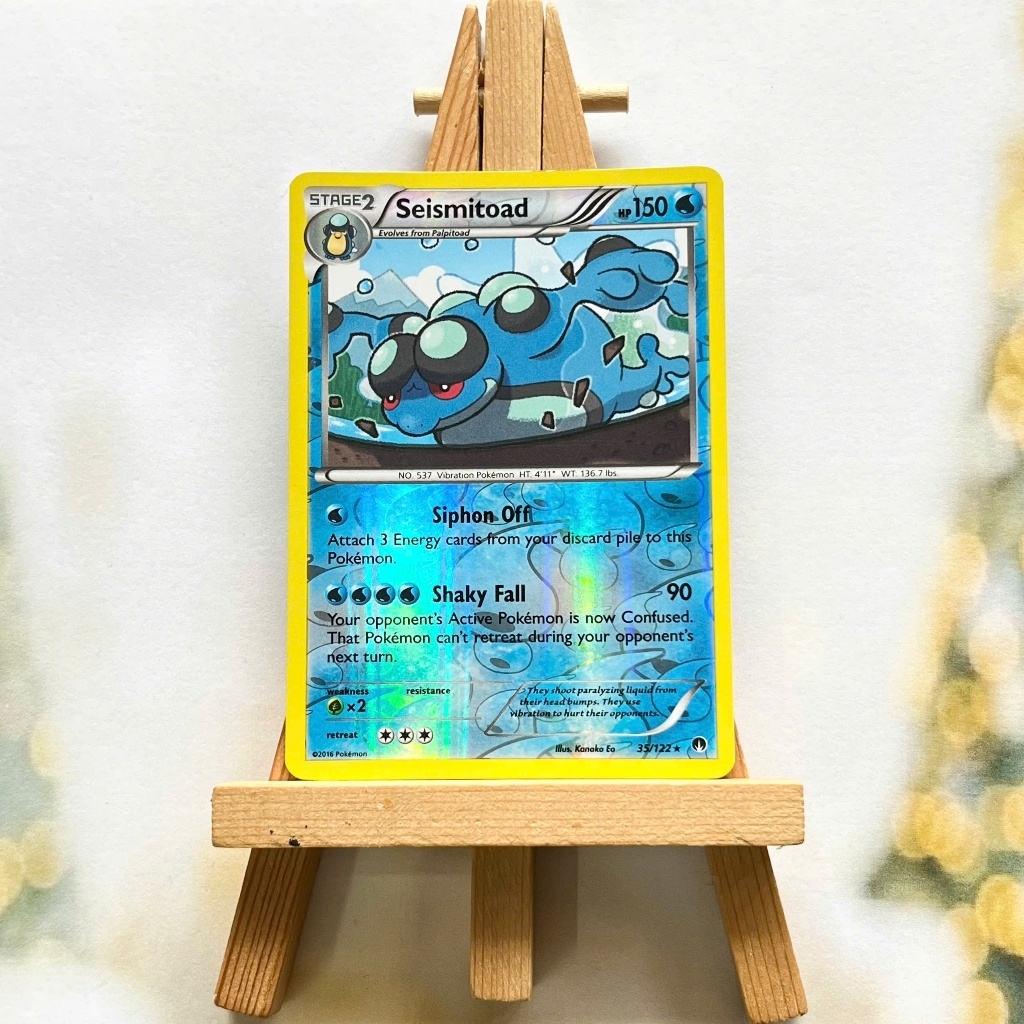 Thẻ hình Pokemon Seismitoad 35/122 - Lá bài XY: Breakpoint Rare Reverse Holo tiếng Anh chính hãng Nintendo - Nhập khẩu Hoa Kỳ USA ➖➖➖➖➖➖ Sản phẩm chính hãng TCG, được sản xuất bởi The Pokémon Company, nên quý khách có thể yên tâm về chất lượng và độ độc đáo của từng thẻ bài. Chúng tôi cam kết chỉ bán hàng chính hãng và nói không với hàng nhái, hàng giả mạo. Mỗi thẻ bài đều ở trong tình trạng NM-M và sẽ là một phần không thể thiếu cho bộ sưu tập của bạn, giúp bạn có những trải nghiệm thú vị và phong phú. Chất liệu chính của thẻ bài là giấy cao cấp, đảm bảo độ bền và màu sắc sống động, chi tiết. Dòng sản phẩm: TCG Hãng sản xuất: The Pokémon Company Chất liệu: Giấy Kích thước thẻ bài: 6,3×8,8cm ➖➖➖➖➖➖ Thông Báo Hướng Dẫn Bảo Quản và Kiểm Tra Sản Phẩm Thẻ Bài: ✅ Quay Video Khi Mở Kiện: Để đảm bảo quyền lợi, khi nhận sản phẩm, vui lòng quay video quá trình mở kiện. Video này sẽ là bằng chứng đối chiếu quý giá, giúp chúng tôi nhanh chóng giải quyết mọi vấn đề và thắc mắc của bạn. ✅ Mọi sản phẩm như Gói thẻ bài (Pack lẻ), Booster Box, Bộ bài nguyên hộp phải còn nguyên niêm phong và bao bì. Chỉ những sản phẩm còn giữ nguyên vẹn mới được chấp nhận đổi trả hoàn tiền. ✅ Các lá bài chính hãng có thể bị cong khi tiếp xúc với không khí. Đây là hiện tượng bình thường, bạn có thể khắc phục bằng cách sử dụng bọc bài, cất vào album, hoặc ép giữa quyển vở dày. ✅ Một số lá bài có thể xuất hiện các vết trầy xước nhỏ, nhưng không ảnh hưởng đến chất lượng và quá trình sử dụng của bạn. ✅ Chúng tôi không chịu trách nhiệm về nội dung bên trong các gói và hộp thẻ bài do đóng gói và niêm phong từ nhà sản xuất. Mọi thắc mắc và khiếu nại, vui lòng liên hệ trực tiếp với chúng tôi, ➖➖➖➖➖➖