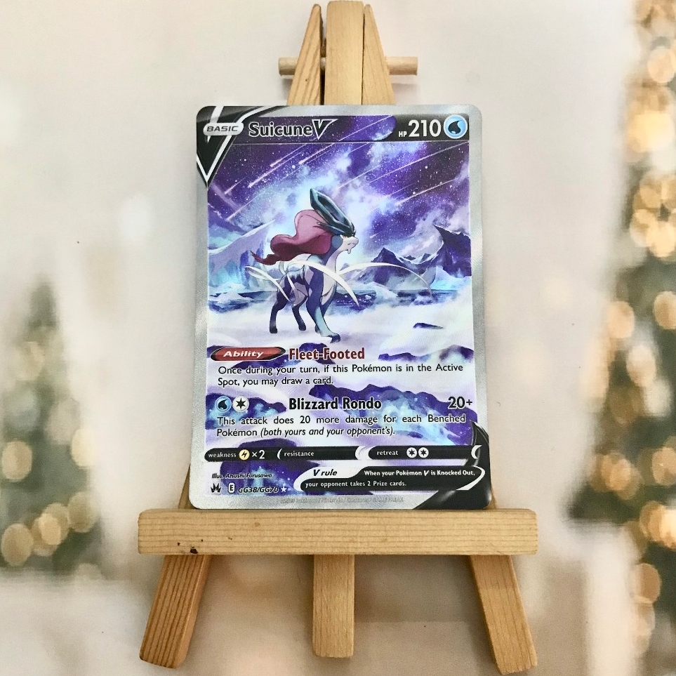 Thẻ hình Pokemon Suicune V GG38/GG70 - Bài lẻ Full Art Ultra Rare tiếng Anh chính hãng Nintendo - Nhập khẩu Hoa Kỳ USA ➖➖➖➖➖➖ Sản phẩm chính hãng TCG, được sản xuất bởi The Pokémon Company, nên quý khách có thể yên tâm về chất lượng và độ độc đáo của từng thẻ bài. Chúng tôi cam kết chỉ bán hàng chính hãng và nói không với hàng nhái, hàng giả mạo. Mỗi thẻ bài đều ở trong tình trạng NM-M và sẽ là một phần không thể thiếu cho bộ sưu tập của bạn, giúp bạn có những trải nghiệm thú vị và phong phú. Chất liệu chính của thẻ bài là giấy cao cấp, đảm bảo độ bền và màu sắc sống động, chi tiết. Dòng sản phẩm: TCG Hãng sản xuất: The Pokémon Company Chất liệu: Giấy Kích thước thẻ bài: 6,3×8,8cm ➖➖➖➖➖➖ Thông Báo Hướng Dẫn Bảo Quản và Kiểm Tra Sản Phẩm Thẻ Bài: ✅ Quay Video Khi Mở Kiện: Để đảm bảo quyền lợi, khi nhận sản phẩm, vui lòng quay video quá trình mở kiện. Video này sẽ là bằng chứng đối chiếu quý giá, giúp chúng tôi nhanh chóng giải quyết mọi vấn đề và thắc mắc của bạn. ✅ Mọi sản phẩm như Gói thẻ bài (Pack lẻ), Booster Box, Bộ bài nguyên hộp phải còn nguyên niêm phong và bao bì. Chỉ những sản phẩm còn giữ nguyên vẹn mới được chấp nhận đổi trả hoàn tiền. ✅ Các lá bài chính hãng có thể bị cong khi tiếp xúc với không khí. Đây là hiện tượng bình thường, bạn có thể khắc phục bằng cách sử dụng bọc bài, cất vào album, hoặc ép giữa quyển vở dày. ✅ Một số lá bài có thể xuất hiện các vết trầy xước nhỏ, nhưng không ảnh hưởng đến chất lượng và quá trình sử dụng của bạn. ✅ Chúng tôi không chịu trách nhiệm về nội dung bên trong các gói và hộp thẻ bài do đóng gói và niêm phong từ nhà sản xuất. Mọi thắc mắc và khiếu nại, vui lòng liên hệ trực tiếp với chúng tôi, ➖➖➖➖➖➖