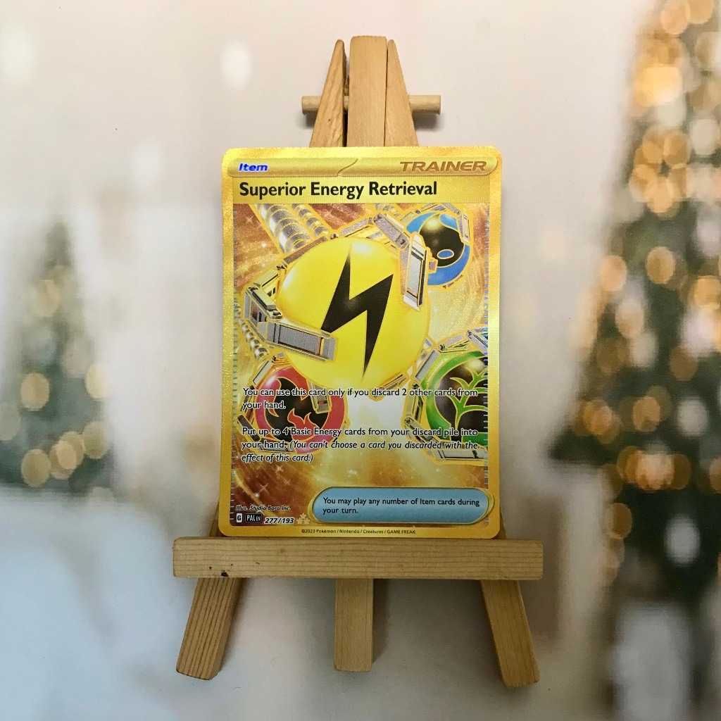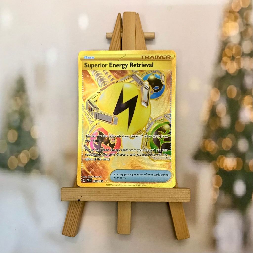Thẻ hình Pokemon Superior Energy Retrieval 277/193 - Bài lẻ Gold Secret tiếng Anh chính hãng Nintendo - Nhập khẩu Hoa Kỳ USA ➖➖➖➖➖➖ Sản phẩm chính hãng TCG, được sản xuất bởi The Pokémon Company, nên quý khách có thể yên tâm về chất lượng và độ độc đáo của từng thẻ bài. Chúng tôi cam kết chỉ bán hàng chính hãng và nói không với hàng nhái, hàng giả mạo. Mỗi thẻ bài đều ở trong tình trạng NM-M và sẽ là một phần không thể thiếu cho bộ sưu tập của bạn, giúp bạn có những trải nghiệm thú vị và phong phú. Chất liệu chính của thẻ bài là giấy cao cấp, đảm bảo độ bền và màu sắc sống động, chi tiết. Dòng sản phẩm: TCG Hãng sản xuất: The Pokémon Company Chất liệu: Giấy Kích thước thẻ bài: 6,3×8,8cm ➖➖➖➖➖➖ Thông Báo Hướng Dẫn Bảo Quản và Kiểm Tra Sản Phẩm Thẻ Bài: ✅ Quay Video Khi Mở Kiện: Để đảm bảo quyền lợi, khi nhận sản phẩm, vui lòng quay video quá trình mở kiện. Video này sẽ là bằng chứng đối chiếu quý giá, giúp chúng tôi nhanh chóng giải quyết mọi vấn đề và thắc mắc của bạn. ✅ Mọi sản phẩm như Gói thẻ bài (Pack lẻ), Booster Box, Bộ bài nguyên hộp phải còn nguyên niêm phong và bao bì. Chỉ những sản phẩm còn giữ nguyên vẹn mới được chấp nhận đổi trả hoàn tiền. ✅ Các lá bài chính hãng có thể bị cong khi tiếp xúc với không khí. Đây là hiện tượng bình thường, bạn có thể khắc phục bằng cách sử dụng bọc bài, cất vào album, hoặc ép giữa quyển vở dày. ✅ Một số lá bài có thể xuất hiện các vết trầy xước nhỏ, nhưng không ảnh hưởng đến chất lượng và quá trình sử dụng của bạn. ✅ Chúng tôi không chịu trách nhiệm về nội dung bên trong các gói và hộp thẻ bài do đóng gói và niêm phong từ nhà sản xuất. Mọi thắc mắc và khiếu nại, vui lòng liên hệ trực tiếp với chúng tôi, ➖➖➖➖➖➖