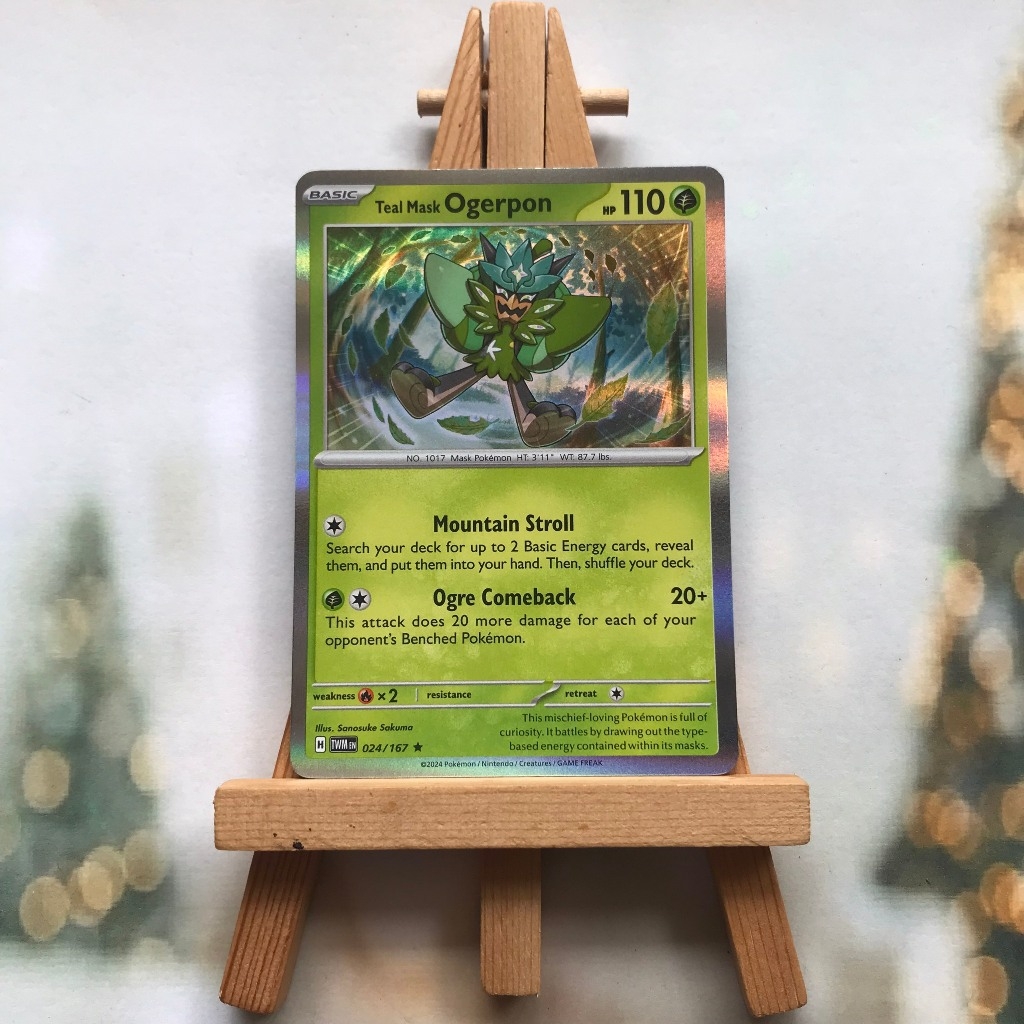 Thẻ hình Pokemon Teal Mask Ogerpon 024/167 - Lá bài lẻ Scarlet & Violet: Twilight Masquerade Holo Rare Reverse Holo tiếng Anh chính hãng Nintendo - Nhập khẩu Hoa Kỳ USA ➖➖➖➖➖➖ Sản phẩm chính hãng TCG, được sản xuất bởi The Pokémon Company, nên quý khách có thể yên tâm về chất lượng và độ độc đáo của từng thẻ bài. Chúng tôi cam kết chỉ bán hàng chính hãng và nói không với hàng nhái, hàng giả mạo. Mỗi thẻ bài đều ở trong tình trạng NM-M và sẽ là một phần không thể thiếu cho bộ sưu tập của bạn, giúp bạn có những trải nghiệm thú vị và phong phú. Chất liệu chính của thẻ bài là giấy cao cấp, đảm bảo độ bền và màu sắc sống động, chi tiết. Dòng sản phẩm: TCG Hãng sản xuất: The Pokémon Company Chất liệu: Giấy Kích thước thẻ bài: 6,3×8,8cm ➖➖➖➖➖➖ Thông Báo Hướng Dẫn Bảo Quản và Kiểm Tra Sản Phẩm Thẻ Bài: ✅ Quay Video Khi Mở Kiện: Để đảm bảo quyền lợi, khi nhận sản phẩm, vui lòng quay video quá trình mở kiện. Video này sẽ là bằng chứng đối chiếu quý giá, giúp chúng tôi nhanh chóng giải quyết mọi vấn đề và thắc mắc của bạn. ✅ Mọi sản phẩm như Gói thẻ bài (Pack lẻ), Booster Box, Bộ bài nguyên hộp phải còn nguyên niêm phong và bao bì. Chỉ những sản phẩm còn giữ nguyên vẹn mới được chấp nhận đổi trả hoàn tiền. ✅ Các lá bài chính hãng có thể bị cong khi tiếp xúc với không khí. Đây là hiện tượng bình thường, bạn có thể khắc phục bằng cách sử dụng bọc bài, cất vào album, hoặc ép giữa quyển vở dày. ✅ Một số lá bài có thể xuất hiện các vết trầy xước nhỏ, nhưng không ảnh hưởng đến chất lượng và quá trình sử dụng của bạn. ✅ Chúng tôi không chịu trách nhiệm về nội dung bên trong các gói và hộp thẻ bài do đóng gói và niêm phong từ nhà sản xuất. Mọi thắc mắc và khiếu nại, vui lòng liên hệ trực tiếp với chúng tôi, ➖➖➖➖➖➖