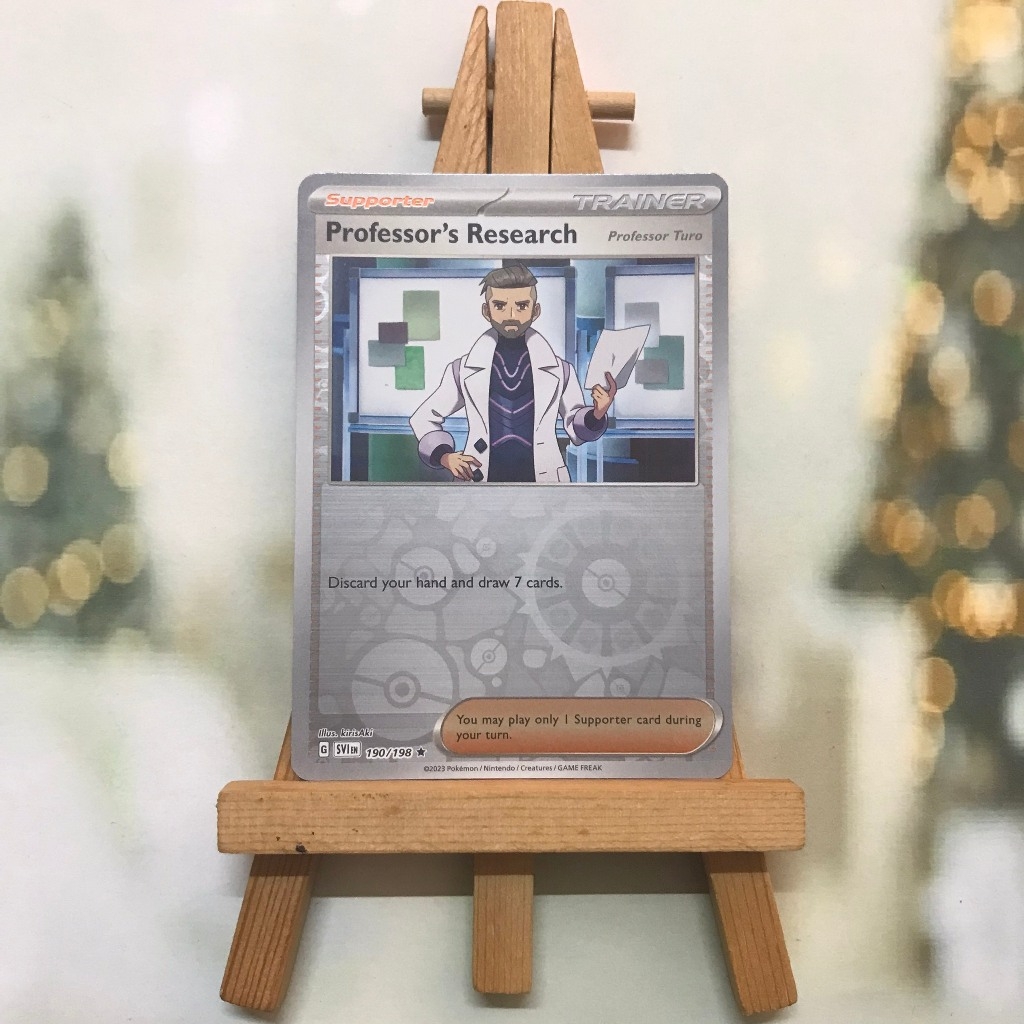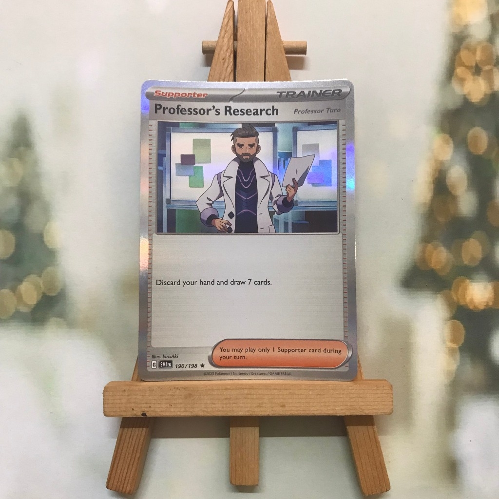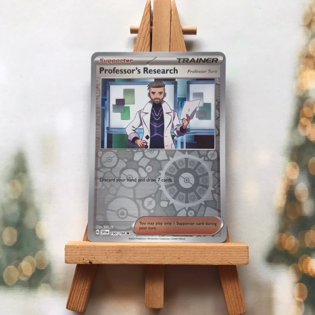 Thẻ hình Pokemon Professor's Research (Professor Turo) 190/198 - Lá bài Scarlet & Violet Base Set Reverse Holo Rare tiếng Anh chính hãng Nintendo - Nhập khẩu Hoa Kỳ USA ➖➖➖➖➖➖ Sản phẩm chính hãng TCG, được sản xuất bởi The Pokémon Company, nên quý khách có thể yên tâm về chất lượng và độ độc đáo của từng thẻ bài. Chúng tôi cam kết chỉ bán hàng chính hãng và nói không với hàng nhái, hàng giả mạo. Mỗi thẻ bài đều ở trong tình trạng NM-M và sẽ là một phần không thể thiếu cho bộ sưu tập của bạn, giúp bạn có những trải nghiệm thú vị và phong phú. Chất liệu chính của thẻ bài là giấy cao cấp, đảm bảo độ bền và màu sắc sống động, chi tiết. Dòng sản phẩm: TCG Hãng sản xuất: The Pokémon Company Chất liệu: Giấy Kích thước thẻ bài: 6,3×8,8cm ➖➖➖➖➖➖ Thông Báo Hướng Dẫn Bảo Quản và Kiểm Tra Sản Phẩm Thẻ Bài: ✅ Quay Video Khi Mở Kiện: Để đảm bảo quyền lợi, khi nhận sản phẩm, vui lòng quay video quá trình mở kiện. Video này sẽ là bằng chứng đối chiếu quý giá, giúp chúng tôi nhanh chóng giải quyết mọi vấn đề và thắc mắc của bạn. ✅ Mọi sản phẩm như Gói thẻ bài (Pack lẻ), Booster Box, Bộ bài nguyên hộp phải còn nguyên niêm phong và bao bì. Chỉ những sản phẩm còn giữ nguyên vẹn mới được chấp nhận đổi trả hoàn tiền. ✅ Các lá bài chính hãng có thể bị cong khi tiếp xúc với không khí. Đây là hiện tượng bình thường, bạn có thể khắc phục bằng cách sử dụng bọc bài, cất vào album, hoặc ép giữa quyển vở dày. ✅ Một số lá bài có thể xuất hiện các vết trầy xước nhỏ, nhưng không ảnh hưởng đến chất lượng và quá trình sử dụng của bạn. ✅ Chúng tôi không chịu trách nhiệm về nội dung bên trong các gói và hộp thẻ bài do đóng gói và niêm phong từ nhà sản xuất. Mọi thắc mắc và khiếu nại, vui lòng liên hệ trực tiếp với chúng tôi.